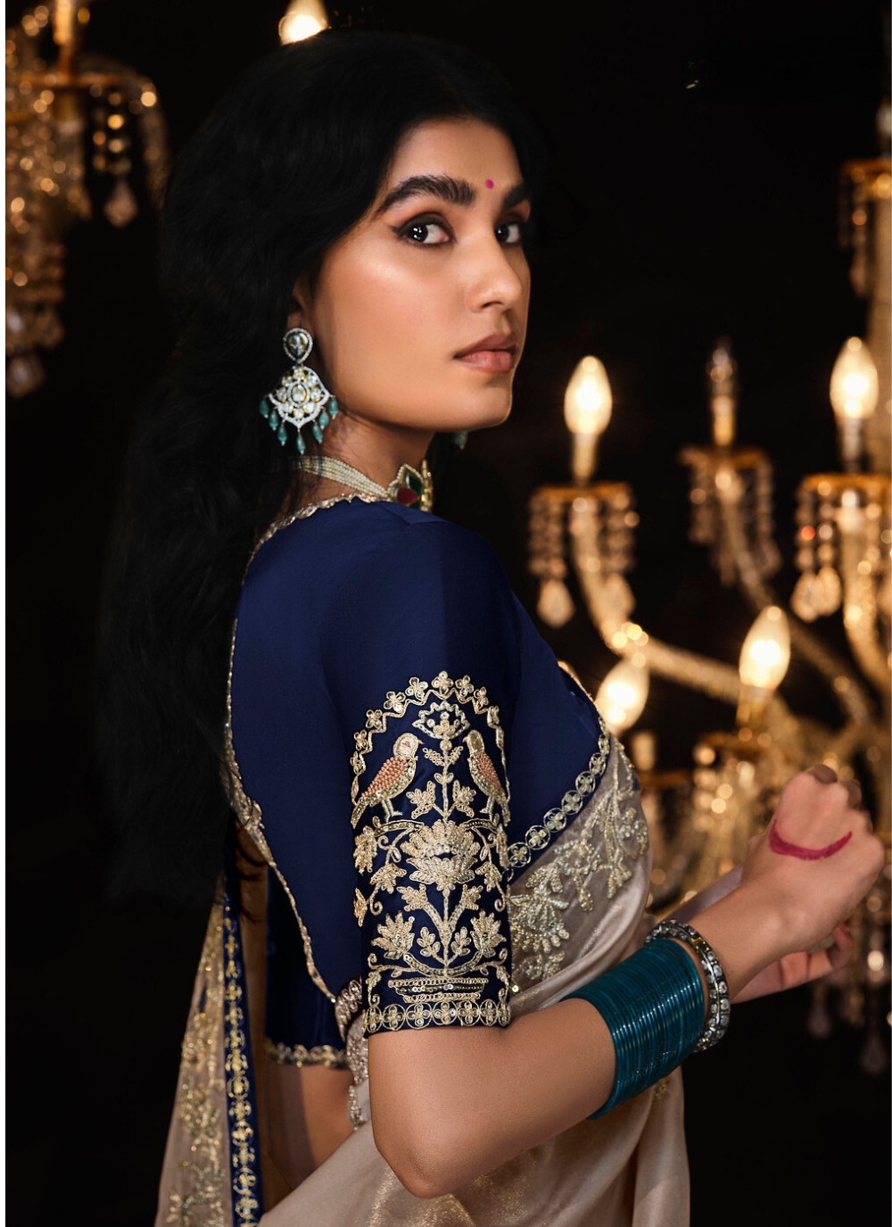 Elevate your wedding look with our Blissful Beige Indian Saree! This show-stopping piece boasts intricate embroidery, glass tissue and silk blouse, and stunning details like tassles, sequins, stones, and zarkan. Turn heads and make a statement on your special day. (Bride not included)