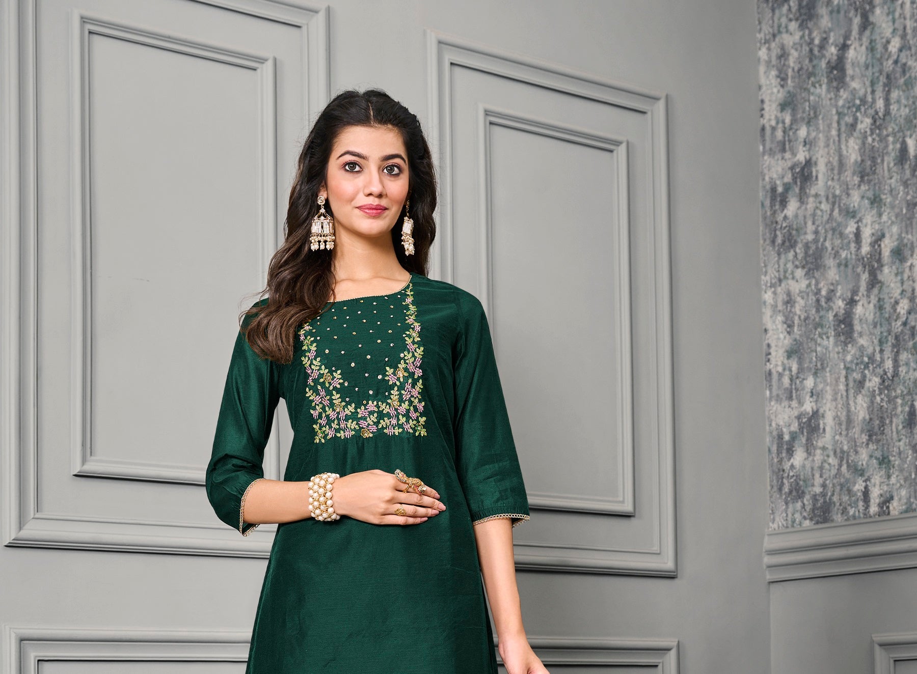 Get ready to turn heads with our gorgeous green cotton silk suit! Featuring a chanderi bottom, organza dupatta, and intricate embroidery work, this suit is perfect for any occasion from office wear to birthday parties. Made with high-quality cotton silk, it's a must-have for your wardrobe. Order online now!