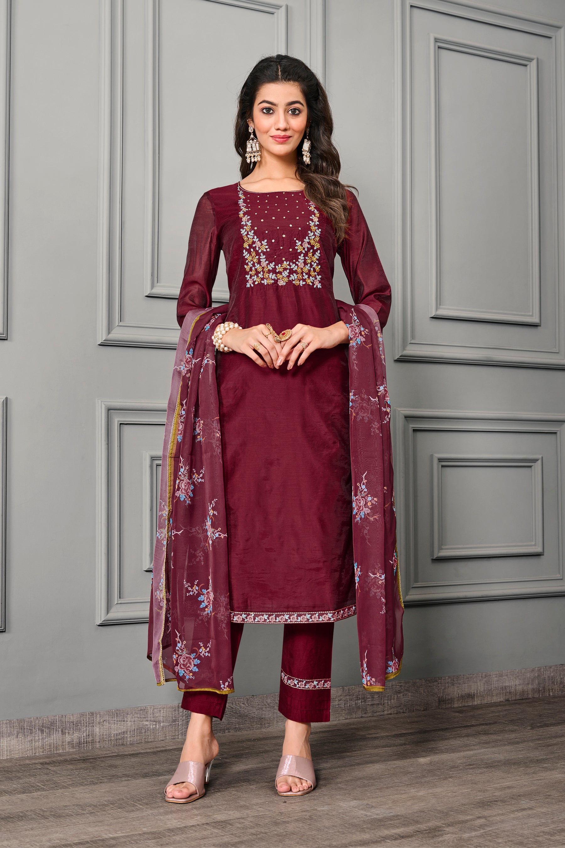 Get ready to turn heads with our uniqueMaroon cotton silk suit! Featuring a chanderi bottom, organza dupatta, and intricate embroidery work, this suit is perfect for any occasion from office wear to birthday parties. Made with high-quality cotton silk, it's a must-have for your wardrobe. Order online now!