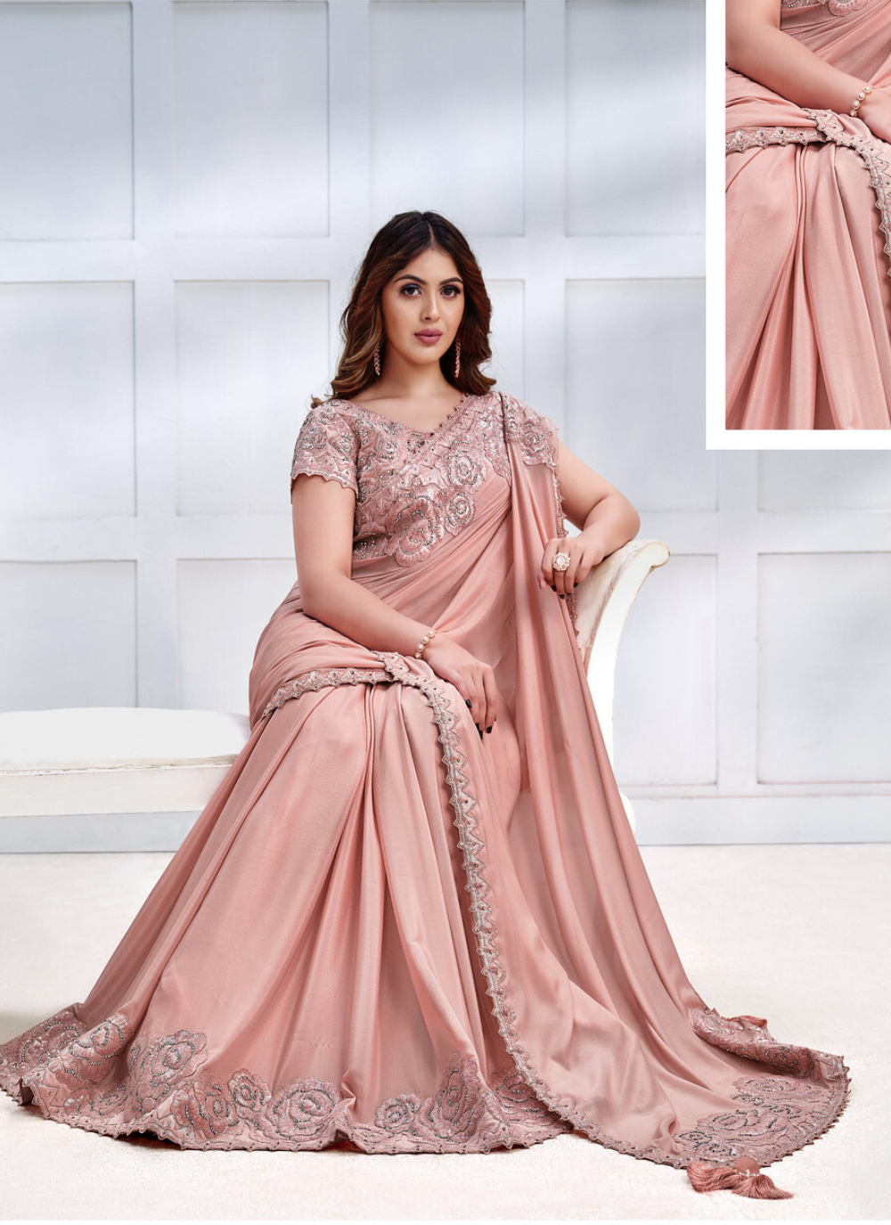 Stand out in the crowd with the Nakshatra Pristine Peach saree! Made with luxurious crepe silk georgette, this saree features intricate cord sequence and stonework, and is paired with a stunning satin silk blouse. Perfect for weddings, parties, or ceremonies, this designer piece will turn heads! Suitable for all age groups!