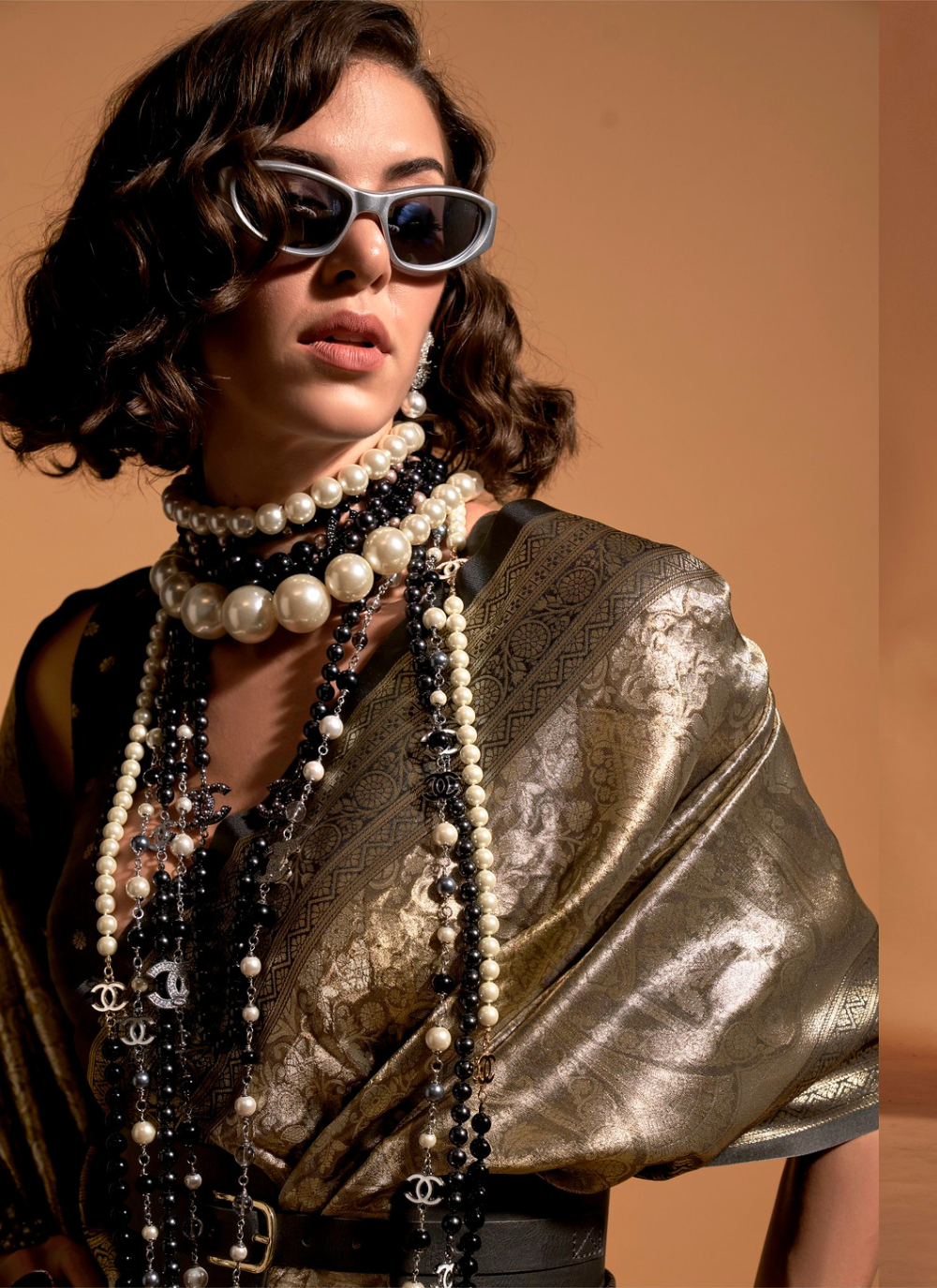 Stand out at any traditional occasion with the Nakshatra Black and gold Kanjeevaram silk saree. The handwoven design shines like a star and features a contrasting border and blouse. Perfect for marriage, parties, or poojas.