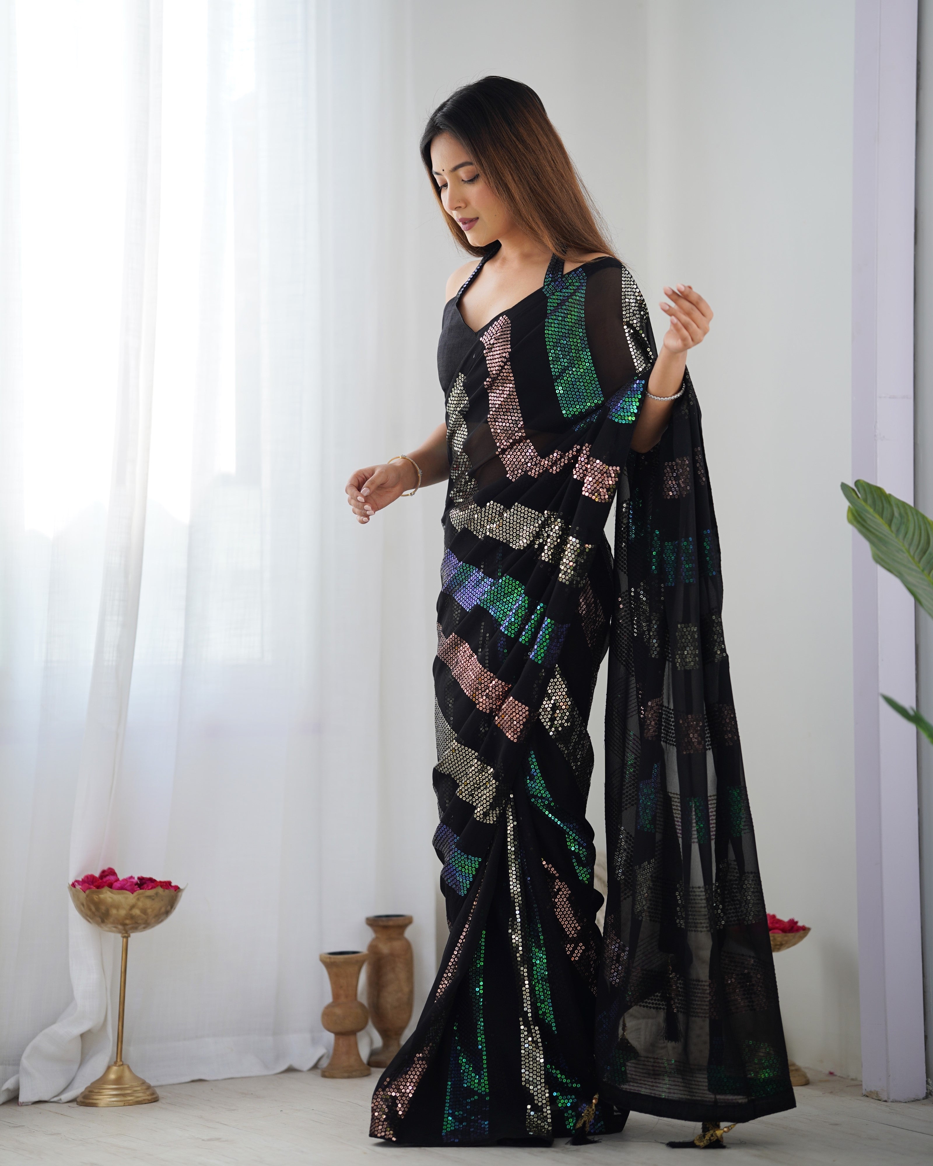 Get ready to steal the spotlight with the Nakshatra Black Dazzling Saree! Made with georgette and adorned with designer embroidery and sequin work, this saree is perfect for any evening party, ceremony, or wedding reception. The heavy sequin blouse adds an extra touch of glamour. Don't be surprised if all eyes are on you! Note: Color may slightly be different from the actual item due to photographic lighting sources or the monitor's settings.
