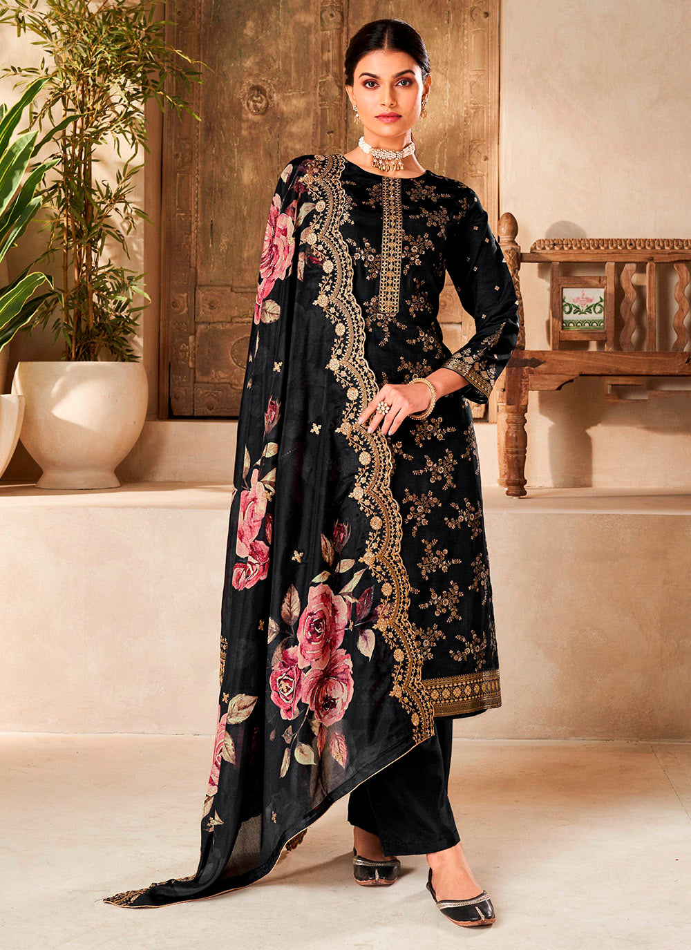 Add some playful and quirky style to your wardrobe with the Nakshatra Black Dola Silk Suit. Made from delicate viscose dola silk, this suit features stunning jaquarda weaving, zari work, and border work. The beautiful digital printed chinon dupatta adds a unique touch. Perfect for your next party, pair with dull santoon bottoms for a complete look. Note: Color may slightly be different from the actual item due to photographic lighting sources or the monitor's settings.