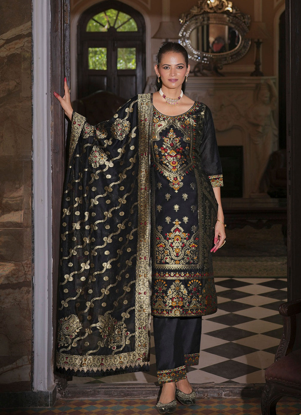 Dive into elegance with the Nakshatra Black Jaquard Banarasi Silk Ready-made Suit! This charming ensemble features a Banarasi silk top, paired with a soft silk bottom and a Banarasi silk dupatta adorned with intricate weaving work. Crafted from luxurious jacquard silk, it shines with zari accents and delicate hand embellishments. Perfect for everyone and any occasion, it’s your go-to for a splash of tradition mixed with a fun, stylish flair. Note: Color may slightly be different from the actual item due to photographic lighting sources or the monitor's settings.