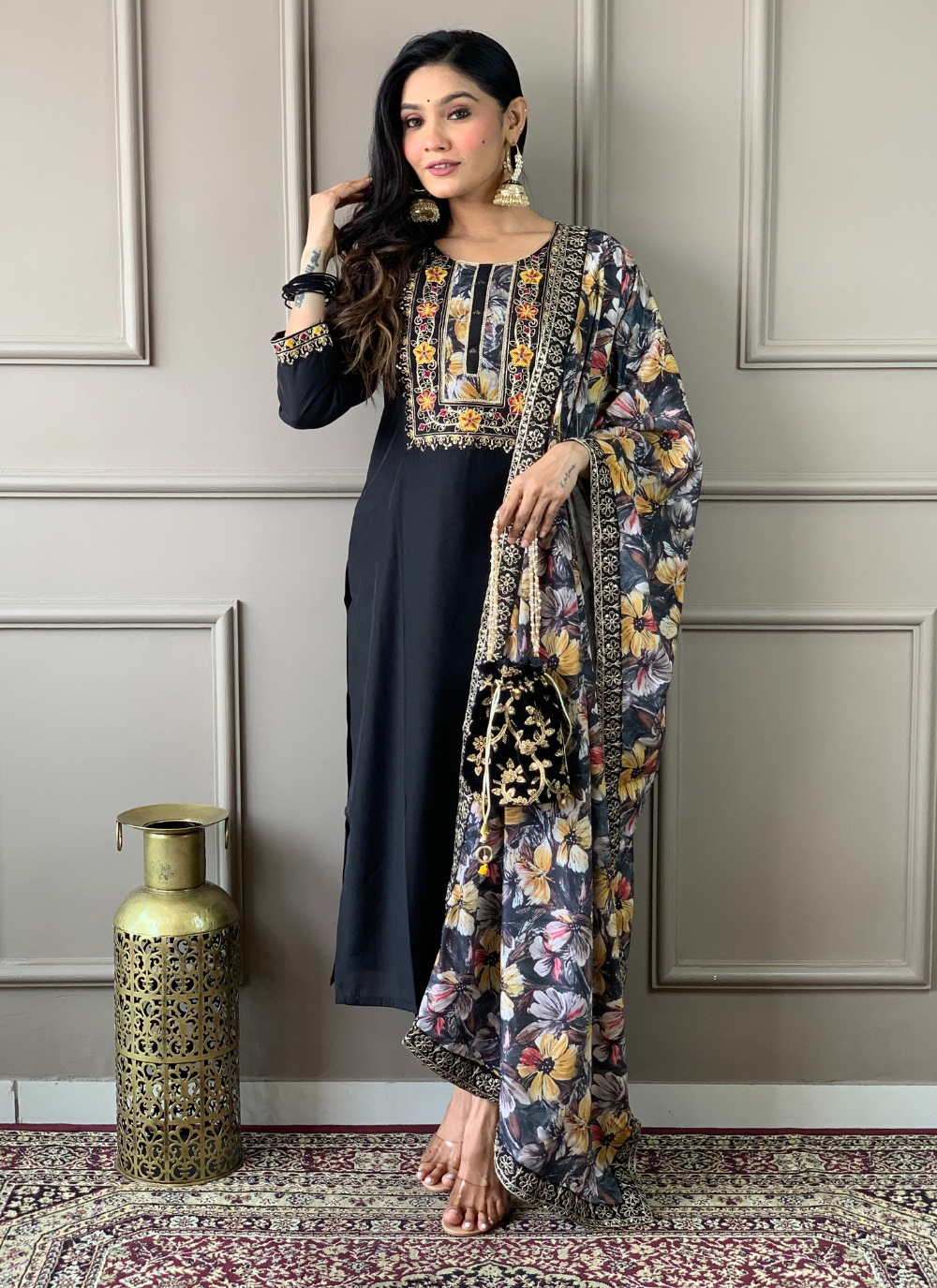 Indulge in luxury and sophistication with our Nakshatra Black Ready Made Designer Suit. Crafted with high-quality fabrics including the finest kameez, sleek bottom fabric, and a beautiful dupatta, this suit is perfect for the office. The exquisite designer embroidery work adds an elegant touch, making you stand out in style. Elevate your wardrobe with this exclusive piece.