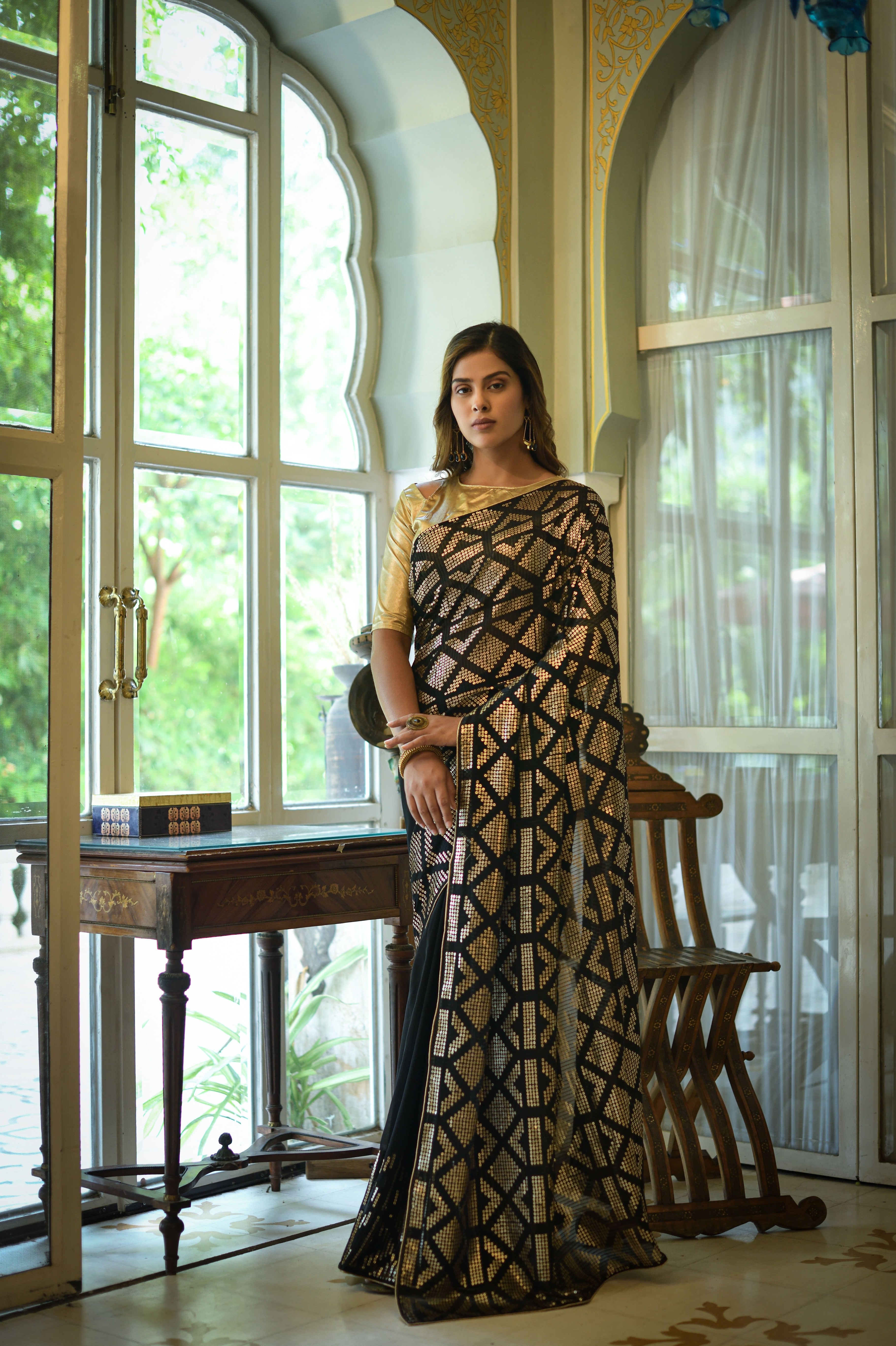 Get ready to make a statement at any party with our Nakshatra Black Sequence Party Wear Saree! The georgette fabric and heavy embroidery add a touch of elegance, while the gold gota blouse gives it a stylish edge. Easy to drape and perfect for a night out, this saree will make you stand out from the crowd. Available in various colors and paired with a gorgeous blouse. Don't miss out on this must-have saree! Note: Color may slightly be different from the actual item due to photographic lighting sources or the monitor's settings.