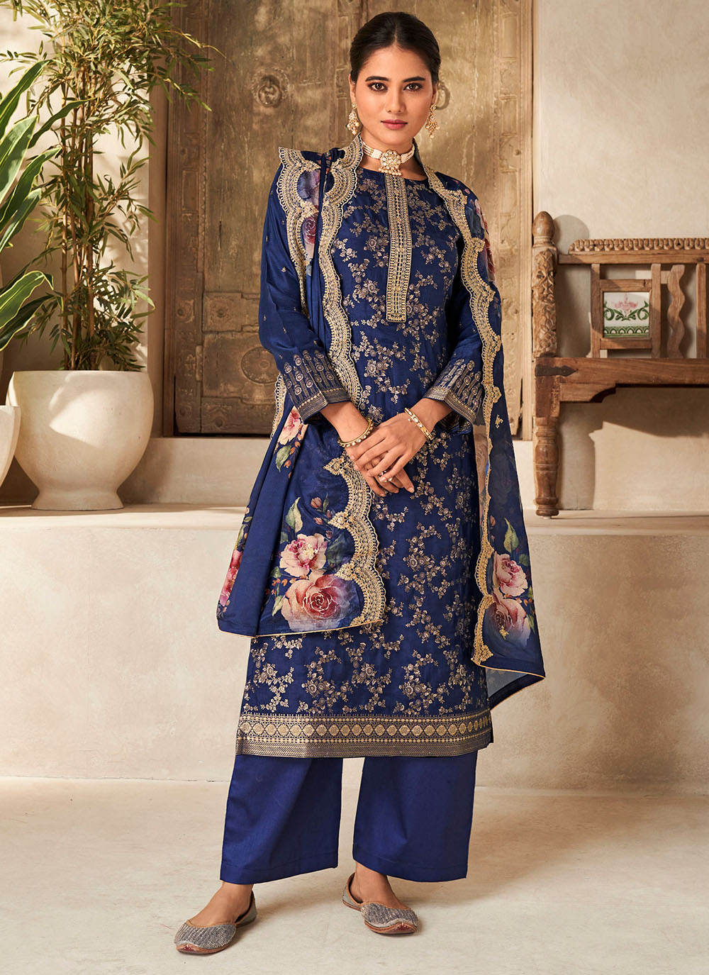 Add some playful and quirky style to your wardrobe with the Nakshatra Blue Dola Silk Suit. Made from delicate viscose dola silk, this suit features stunning jaquarda weaving, zari work, and border work. The beautiful digital printed chinon dupatta adds a unique touch. Perfect for your next party, pair with dull santoon bottoms for a complete look. Note: Color may slightly be different from the actual item due to photographic lighting sources or the monitor's settings.