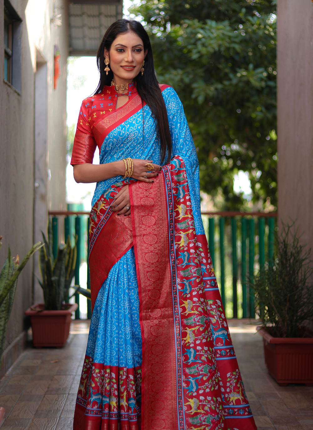 Let your playful side shine with our Nakshatra Blue Kalamkari Silk saree! Made from luxurious dola silk, it features a stunning multicolored digital print kalamkaari design and a beautiful zari border on the saree and blouse. This versatile piece adds charm and sophistication to your wardrobe. Elevate your style and stand out from the crowd! Note: Color may slightly be different from the actual item due to photographic lighting sources or the monitor's settings.