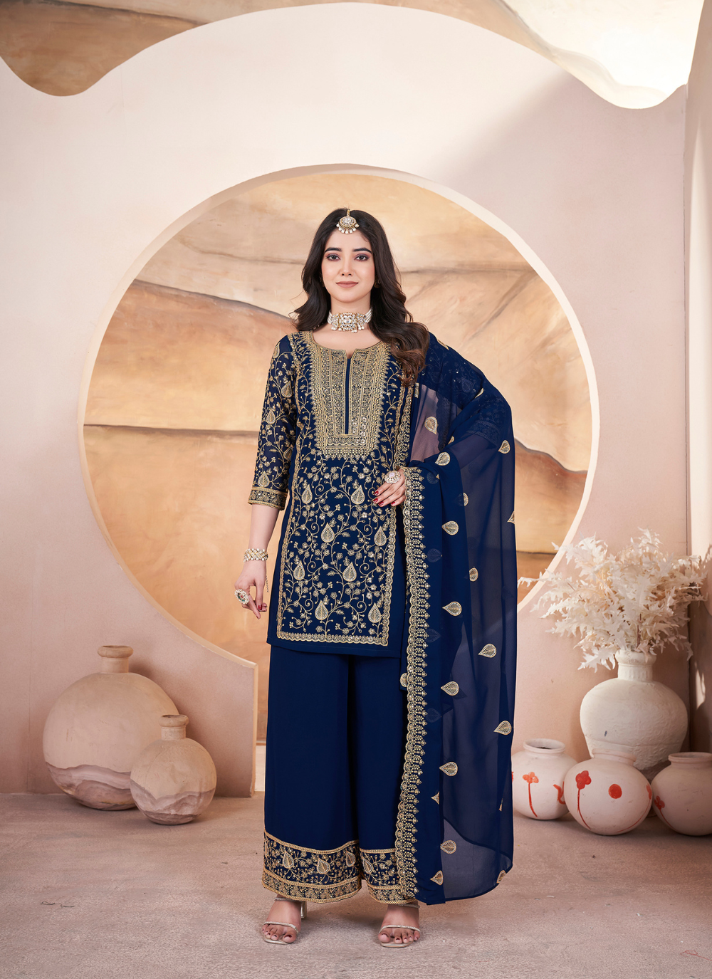 Step out in style with this Nakshatra Blue Readymade Plazzo Suit! The attractive and beautiful design of this readymade plazzo top and bottom with dupatta will make you stand out. Made with high-quality georgette fabric and adorned with designer sequins and beautiful jari embroidery work, this suit is perfect for any occasion. Note: Color may slightly be different from the actual item due to photographic lighting sources or the monitor's settings.
