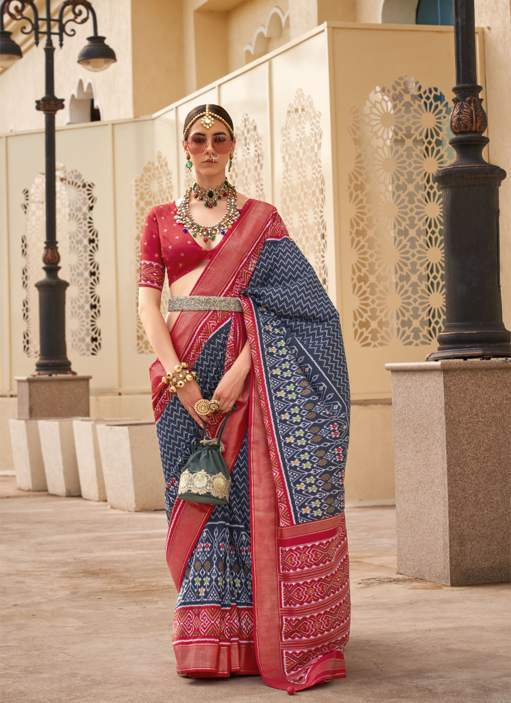 Elevate your style with the Nakshatra Blue Soft Patola Silk Saree. This elegant saree is perfect for weddings, festivals, and any occasion that calls for a touch of sophistication. Made with love, its unique print and tassel detail are sure to turn heads. Pair with heels or flats for a graceful and eye-catching look. Note: Color may slightly be different from the actual item due to photographic lighting sources or the monitor's settings.
