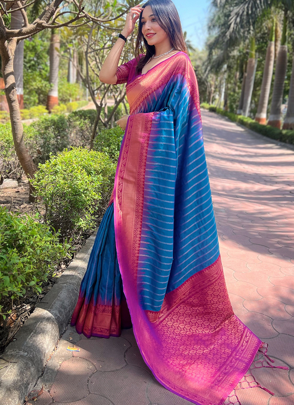 Elevate your look with the Nakshatra Blue Soft Silk Saree. Made from soft silk, this saree features tiny flower motifs and a stunning contrast Zari woven border. The rich contrast zari woven pallu adds a touch of elegance. Complete with a contrast plain blouse, this saree is perfect for parties and special occasions. Fine fabric, intricate weaving, stunning contrast, rich pallu. Note: Color may slightly be different from the actual item due
