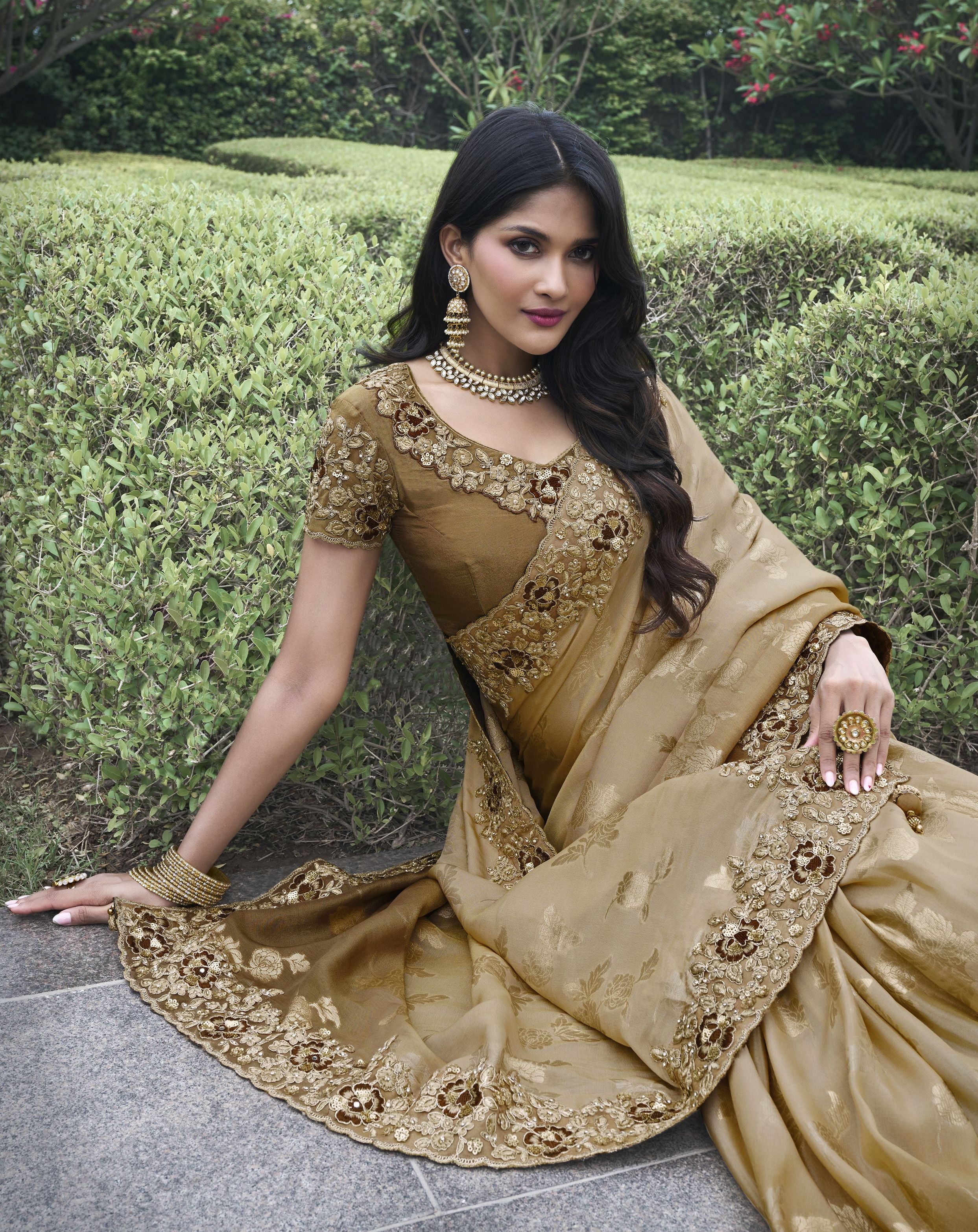 Shine bright in this luxurious Nakshatra Brown Wedding Wear Saree. Made with Berige Viscose Silk Blend and adorned with Jacquard Butti and Resham Zari Embroidery, this saree will make you stand out at any occasion. Comes with a matching blouse piece. Easy to wear and maintain.Note: Color may slightly be different from the actual item due