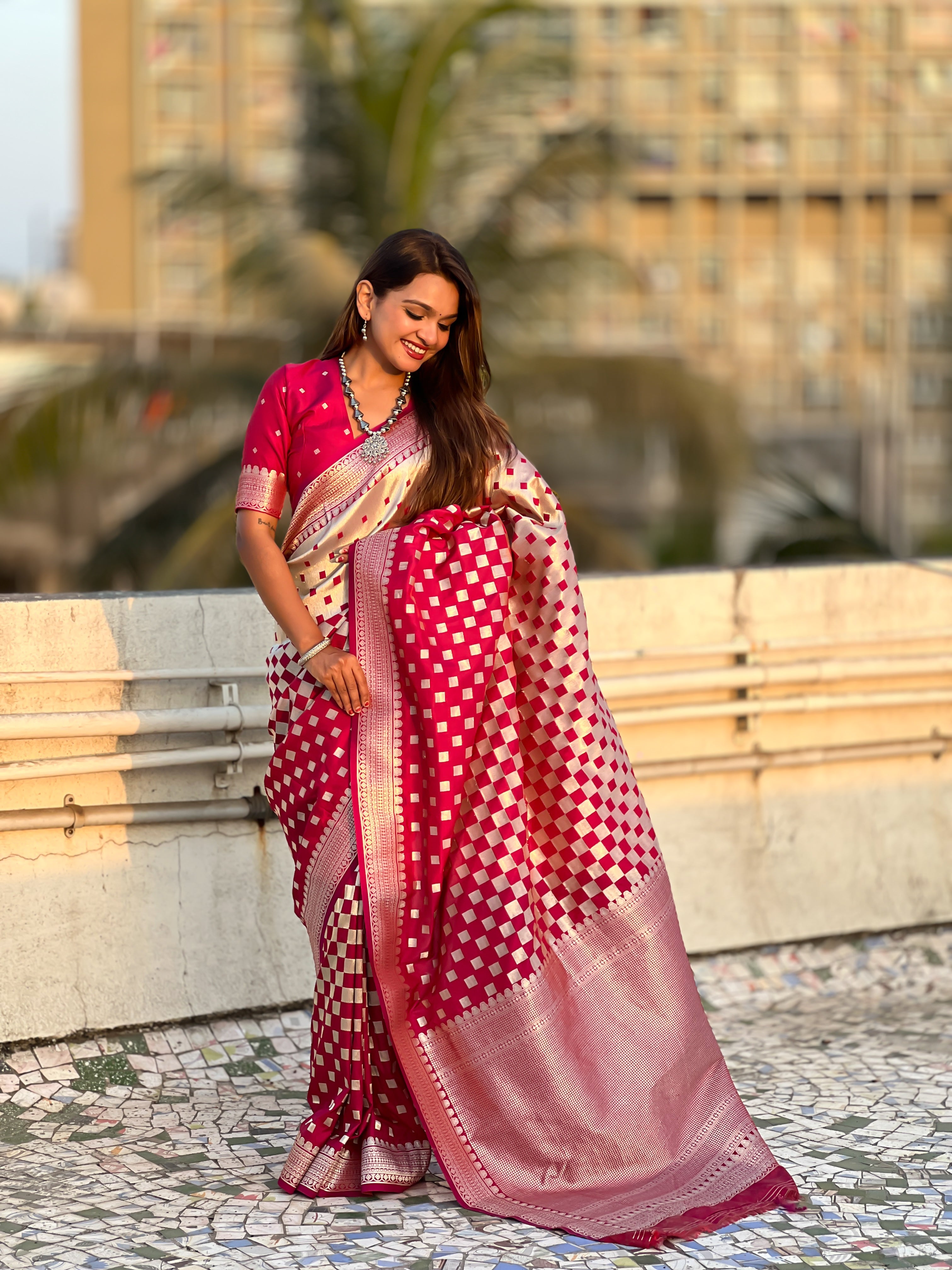 Get ready to turn heads at any special occasion with the Nakshatra Cherry Silver Zari Silk Saree. Made with banarsi silk and adorned with silver zari checks patterns, this sari exudes a royal and elegant look. Perfect for receptions, weddings, and ceremonies, this attractive party wear will surely make you stand out. Note: Color may slightly be different from the actual item due to photographic lighting sources or the monitor's settings.