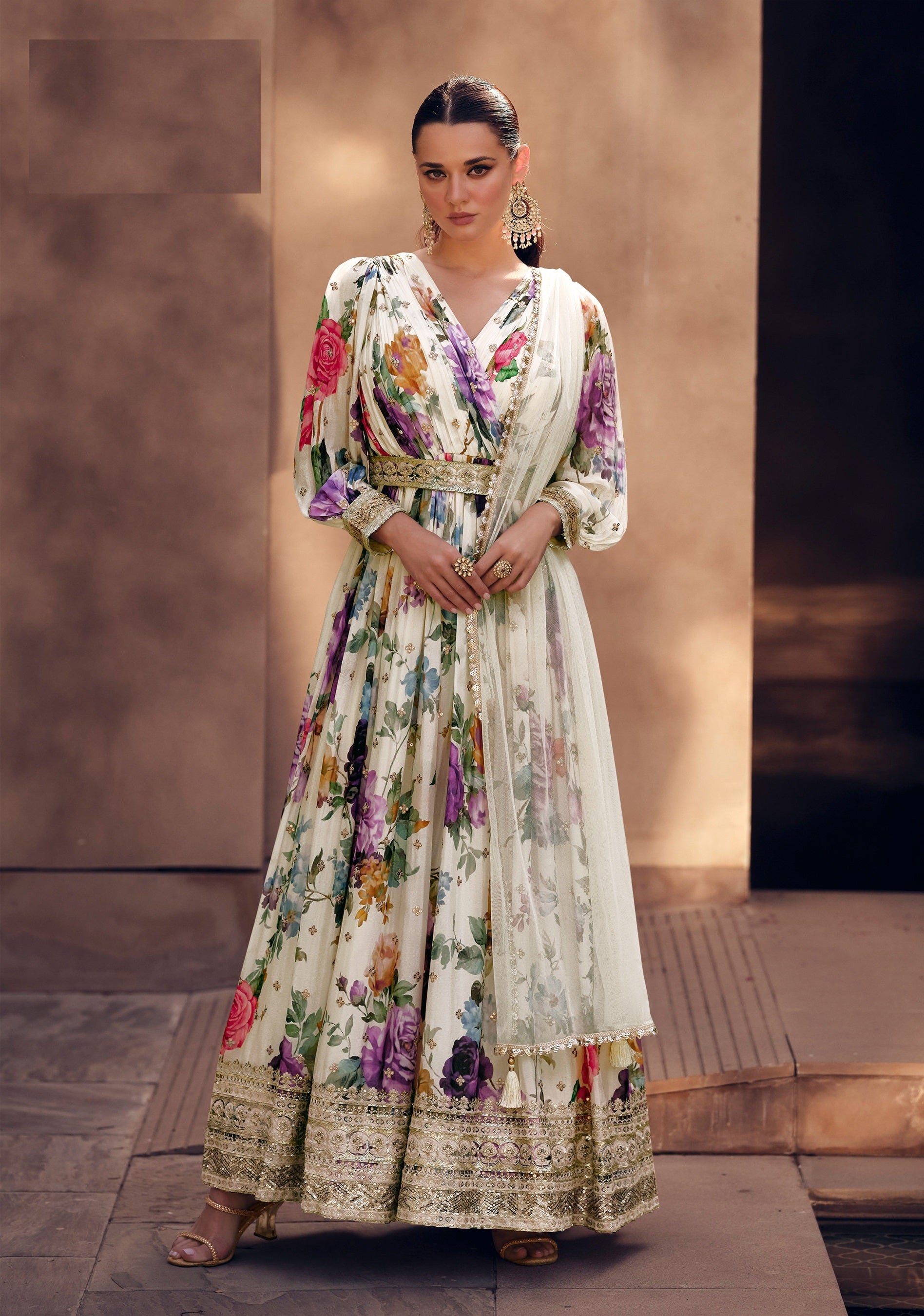Be the life of the party in the Nakshatra Cream Multicolored Anarkali suit! Made of soft georgette, it's adorned with a designer sleeves and belt , intricate lace and buttis on the dupatta, a beautiful neck pattern, and heavy embroidery on the bottom. Perfect for any occasion, turn heads with this fun and stylish party wear.