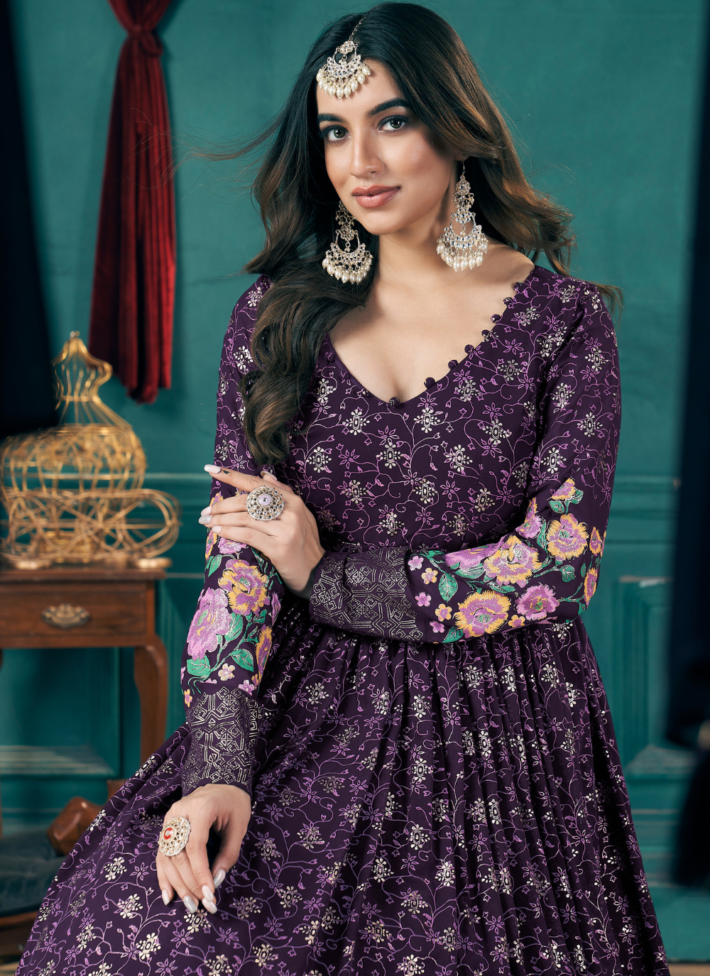 Revamp your party look with Nakshatra's Dark Purple Georgette Suits! The faux georgette fabric paired with satin crepe inner adds a touch of luxury. The metallic foil work and designer thread embroidery make it a statement piece. Conveniently ready-made, this indo-western gown comes with an alluring georgette dupatta. (Now that's what we call fashion goals!