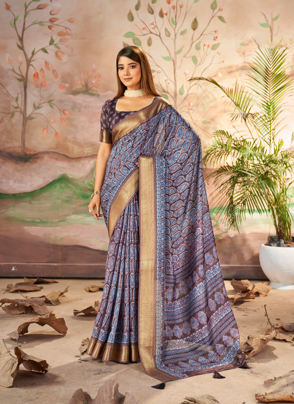 Feel like a legend in this Nakshatra Designer Digital Print Blue saree! Made from dola silk, this saree features a unique digital print in shades of blue and white, complemented by a zari weaving border. Perfect for all ages and exuding class, this saree is a must-have for any collection. (Fashionista's fave!)