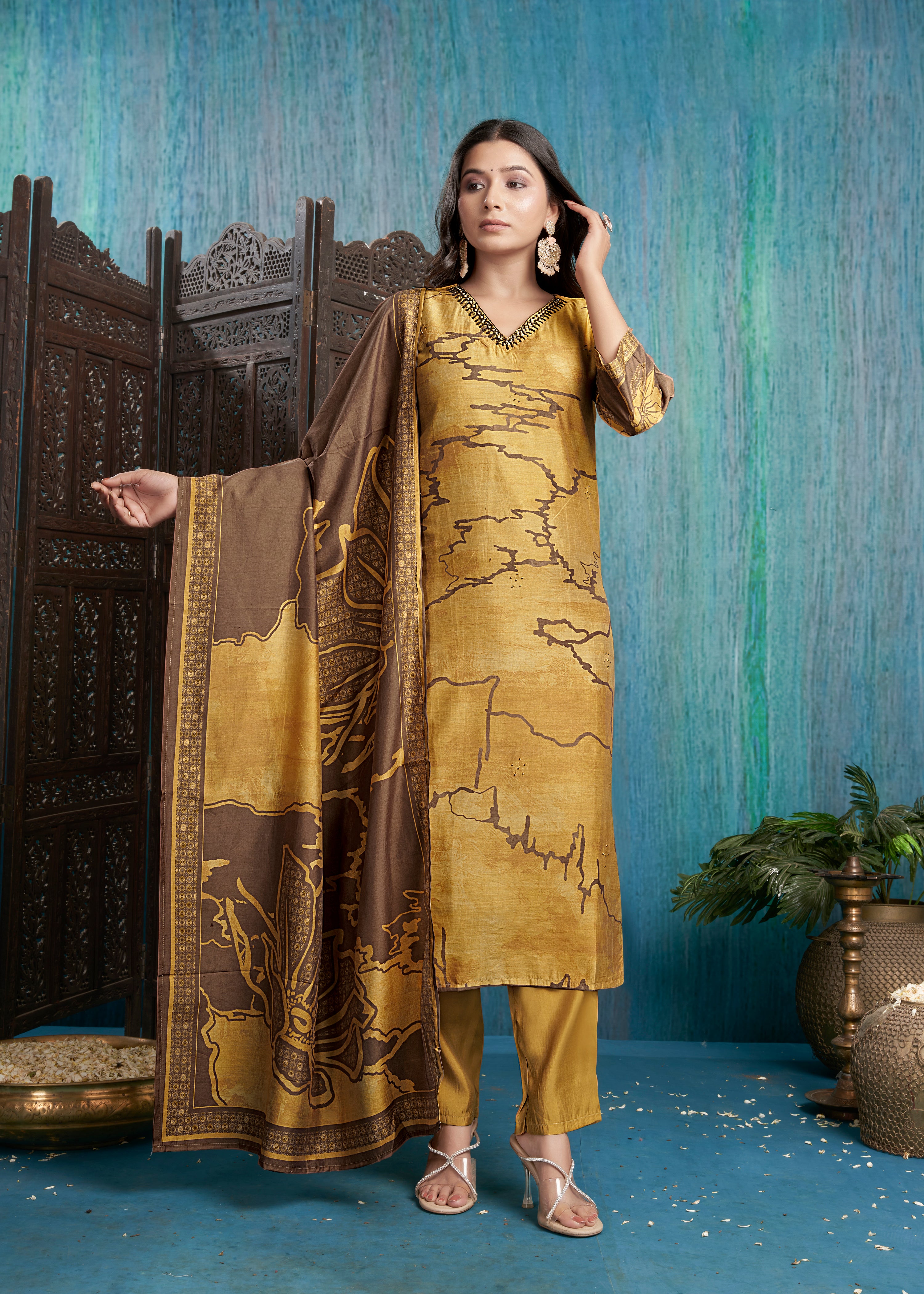 Turn heads wherever you go with the Nakshatra Digitally Print Mustard Readymade Suit! Crafted from a luxurious blend of brown and gold silk and viscose, its vibrant digital prints create an irresistible charm. Complete with a matching bottom and dupatta, this suit offers a perfect blend of playful style and elegant comfort—ideal for brightening up your office or daily wardrobe. Note: Color may slightly be different from the actual item due to photographic lighting sources or the monitor's settings.