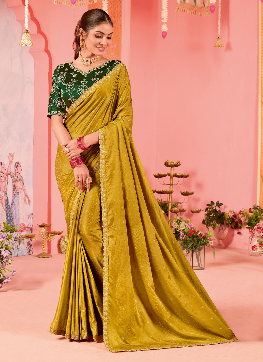 Elevate your style with the Nakshatra Gold Silk Jacquard Saree. Made with satin jacquard fabric, this saree boasts intricate designer embroidery and weaving for a stunning look. Complete with a contrasting blouse featuring heavy work, this saree is perfect for any occasion, from parties to festivals to temple visits. Note: Color may slightly be different from the actual item due to photographic lighting sources or the monitor's settings.