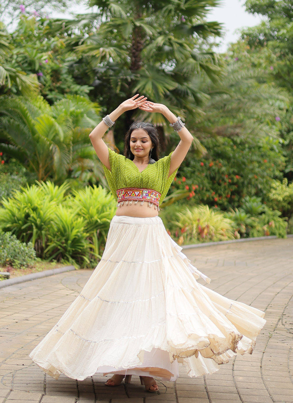 Get ready to rock the dandiya night with our Nakshatra Green Chaniya choli! Featuring a beautiful pink georgette choli with lehariya print and kutchi work in the center. The flared kora cotton lehenga comes with a 12-meter flare and tassels for that extra flair. A perfect blend of modern and traditional style, this outfit is a must-have for the upcoming Navratri celebration.
