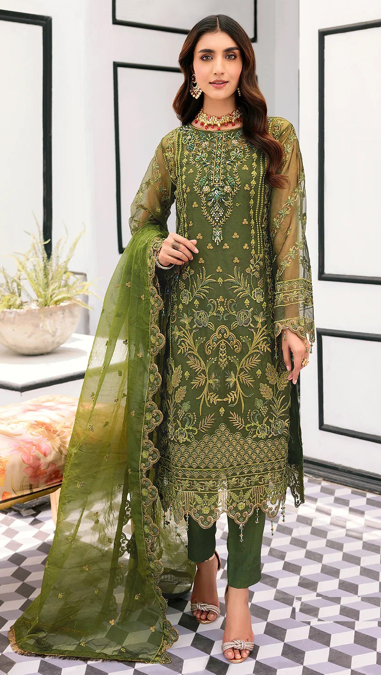 Introducing the Nakshatra Green Embroidered Suit, made with premium fabric organza and santoon. The organza top is adorned with beautiful lace and sequence work on the sleeves and suit, while the santoon inner adds to the luxurious feel. Complete the look with the stunning organza dupatta featuring heavy designer embroidery. Show off your unique style with this playful and quirky suit! Note: Color may slightly be different from the actual item due to photographic lighting sources or the monitor's settings.