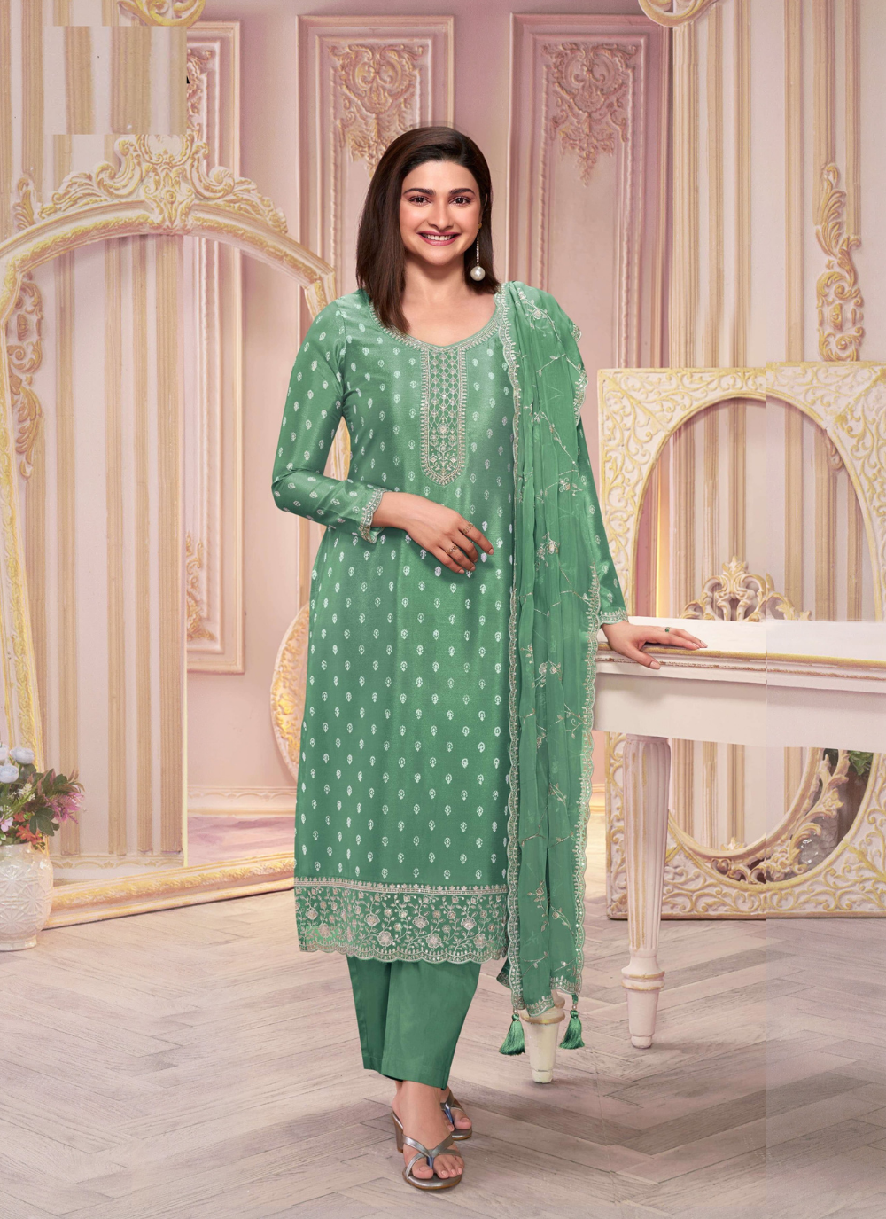 Get ready to turn heads in our Nakshatra Green Light Party Wear Suit! Made with luxurious silk georgette fabric, soft santoon bottom, and a stylish chinon dupatta with intricate embroidery and shimmery sequence work, this suit is the perfect mix of elegance and playfulness. Stand out at any party or event with this unique and eye-catching outfit. Note: Color may slightly be different from the actual item due to photographic lighting sources or the monitor's settings.