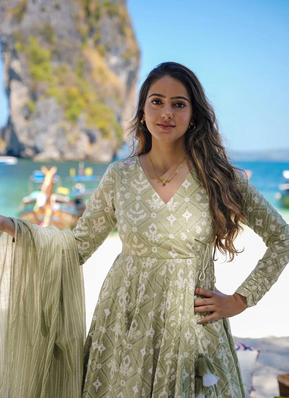 Make a statement this summer with our Nakshatra Green Maslin Printed Readymade Suit! This Anarkali style suit, made from lightweight maslin fabric, is designed for hot days. Its trendy digital print and unique angrakha pattern will add a touch of quirk to your wardrobe. Must-have for summer! Note: Color may slightly be different from the actual item due to photographic lighting sources or the monitor's settings.