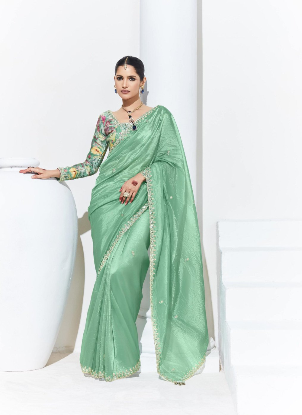 Add some sparkle to your ceremonial or party look with the Nakshatra Green Saree. Made with glass tissue organza, this saree features a playful combination of sequin work, thread embroidery, and butti all along the border. Plus, the heavy satin silk blouse boasts digital print and intricate embroidery on the sleeves, back, and neck. It's a lovely choice for any occasion!