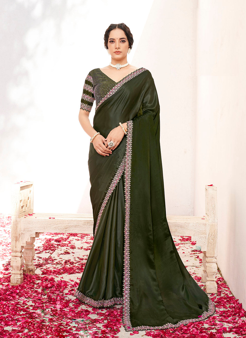 Step into the spotlight with this stunning green crepe satin silk saree, radiating elegance and charm with every drape. Crafted from premium crepe shimmer silk, this designer saree effortlessly blends tradition with trend. The subtle rust undertones and soft shimmer add a touch of glamour, making it ideal for parties, weddings, or festive celebrations.