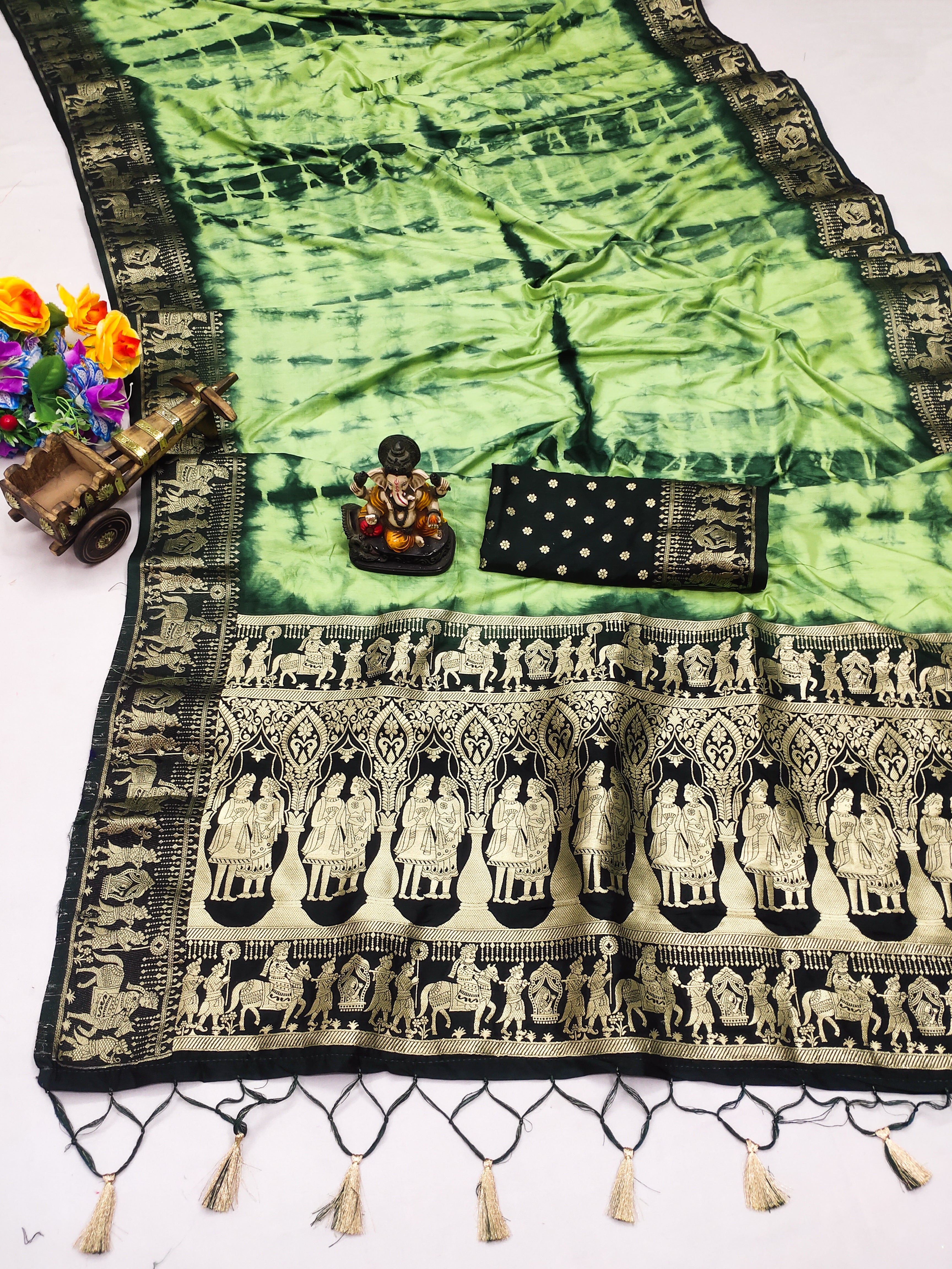 This dola silk saree features a stunning Green shade with a zari weaving border and Sibori print, making it a unique piece for parties and celebrations. Embrace the quirky and playful tone of this description as you wow everyone with this Nakshatra designer saree!