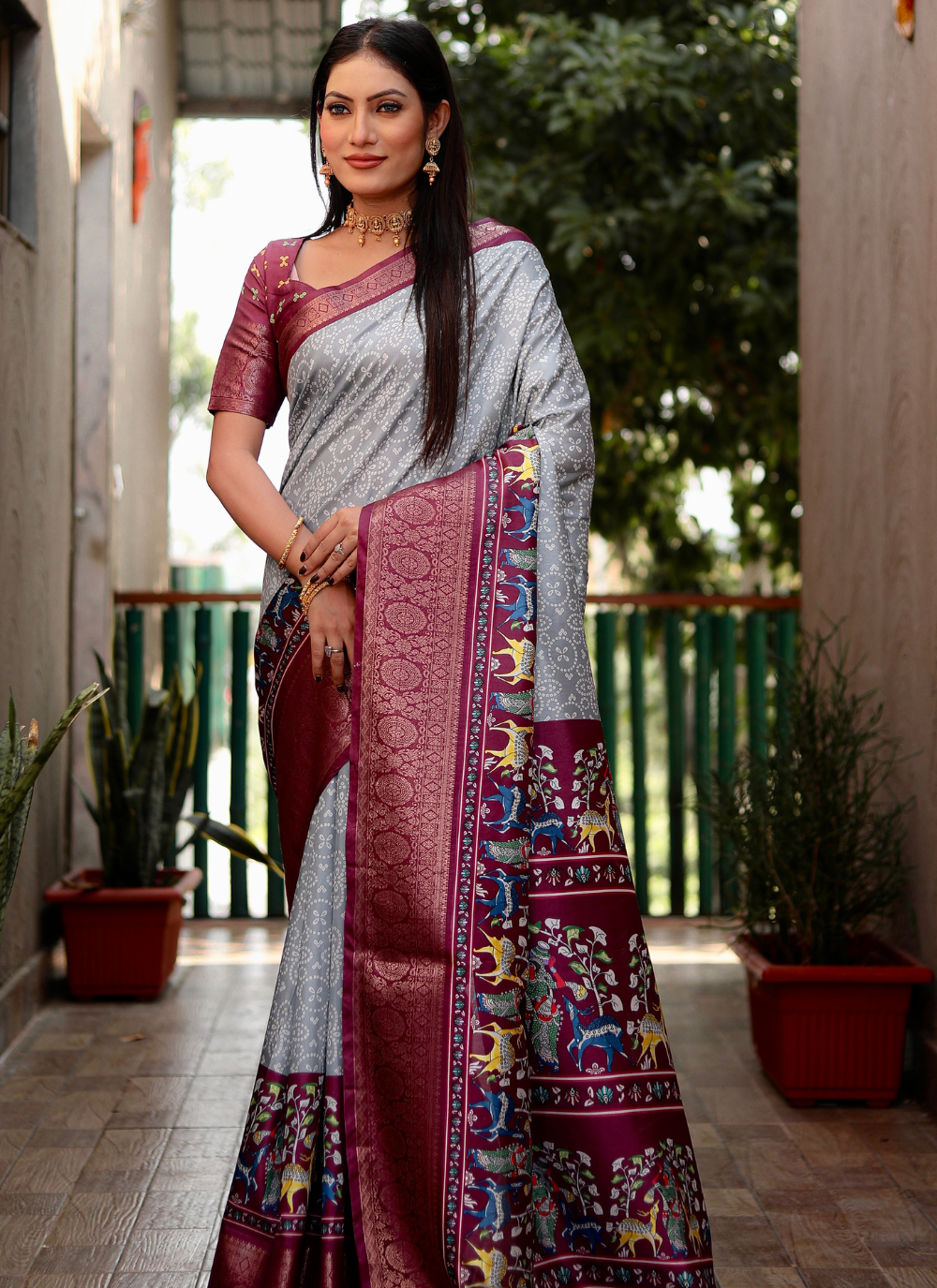 Introducing our Nakshatra Grey Kalamkari Silk saree - the perfect addition to your wardrobe. Made from luxurious dola silk, it features a stunning multicolored digital print kalamkaari design and a beautiful zari border on the saree and blouse. Suitable for all ages, it exudes sophistication with a touch of charm. Elevate your style with this unique, playful and elegant saree! Note: Color may slightly be different from the actual item due