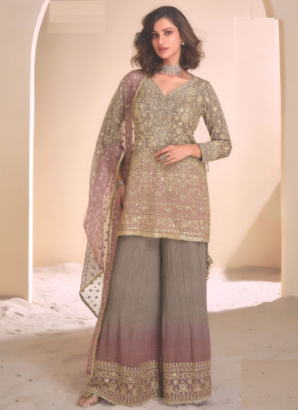 Elevate your style with our Nakshatra Grey Sharara Suit. Featuring a heavy embroidered top with hand Swarovski, embroidered palazzo, and dupatta, this real georgette suit exudes luxury and timeless beauty. Perfect for weddings and festivals, it's an elegant ensemble that will make you stand out. Shop now! Note: Color may slightly be different from the actual item due to photographic lighting sources or the monitor's settings.