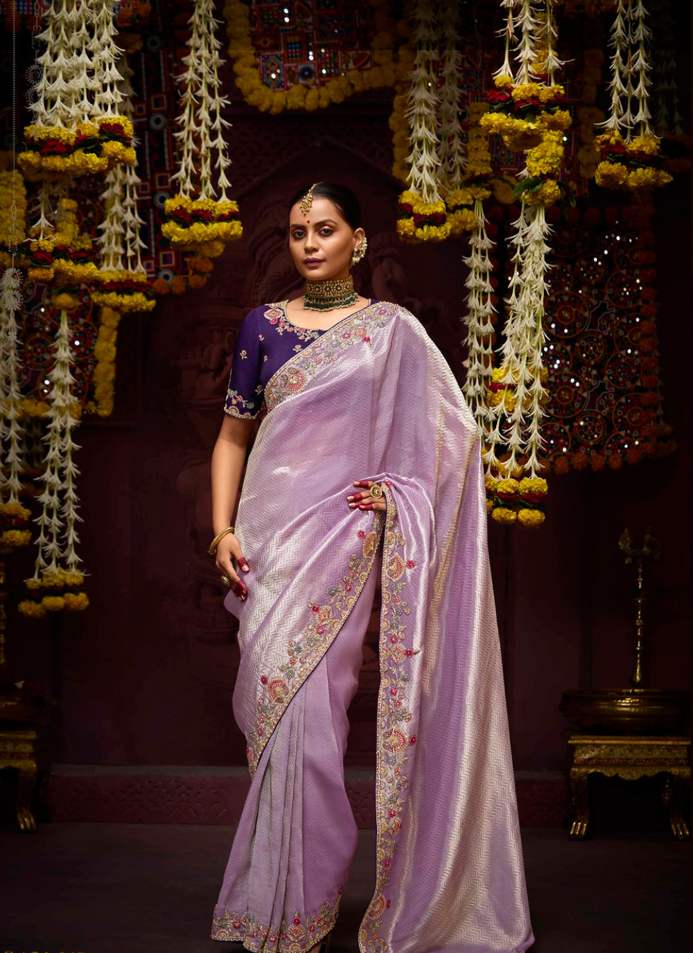 Get ready to dazzle in this stunning Nakshatra Lavender Banarasi Kanjivaram Designer Saree! Made with premium quality fabric, this saree features exquisite embroidery work, a beautiful butti border, and a heavy designer blouse. The pure Banarasi kanjivaram fabric is adorned with hand embellishments including pearls, khatli, zari weaving, sequins, and stones. The tassle pallu adds the perfect finishing touch. Stand out at weddings, parties, or any special occasion with this unique and gorgeous saree! Note: Color may slightly be different from the actual item due to photographic lighting sources or the monitor's settings.