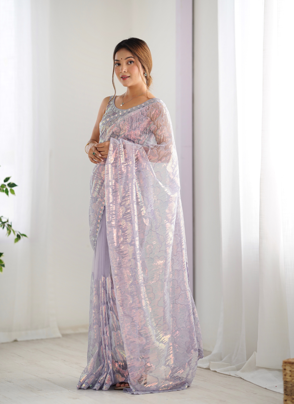 Elevate your saree game with the Nakshatra Cream Embellished Net Saree. Made of Mono Net fabric, this designer saree features stunning sequence embroidery work all over with a mesmerizing HOLOGRAPHIC effect. Perfect for parties, this saree is guaranteed to make you stand out! Note: Color may slightly be different from the actual item due