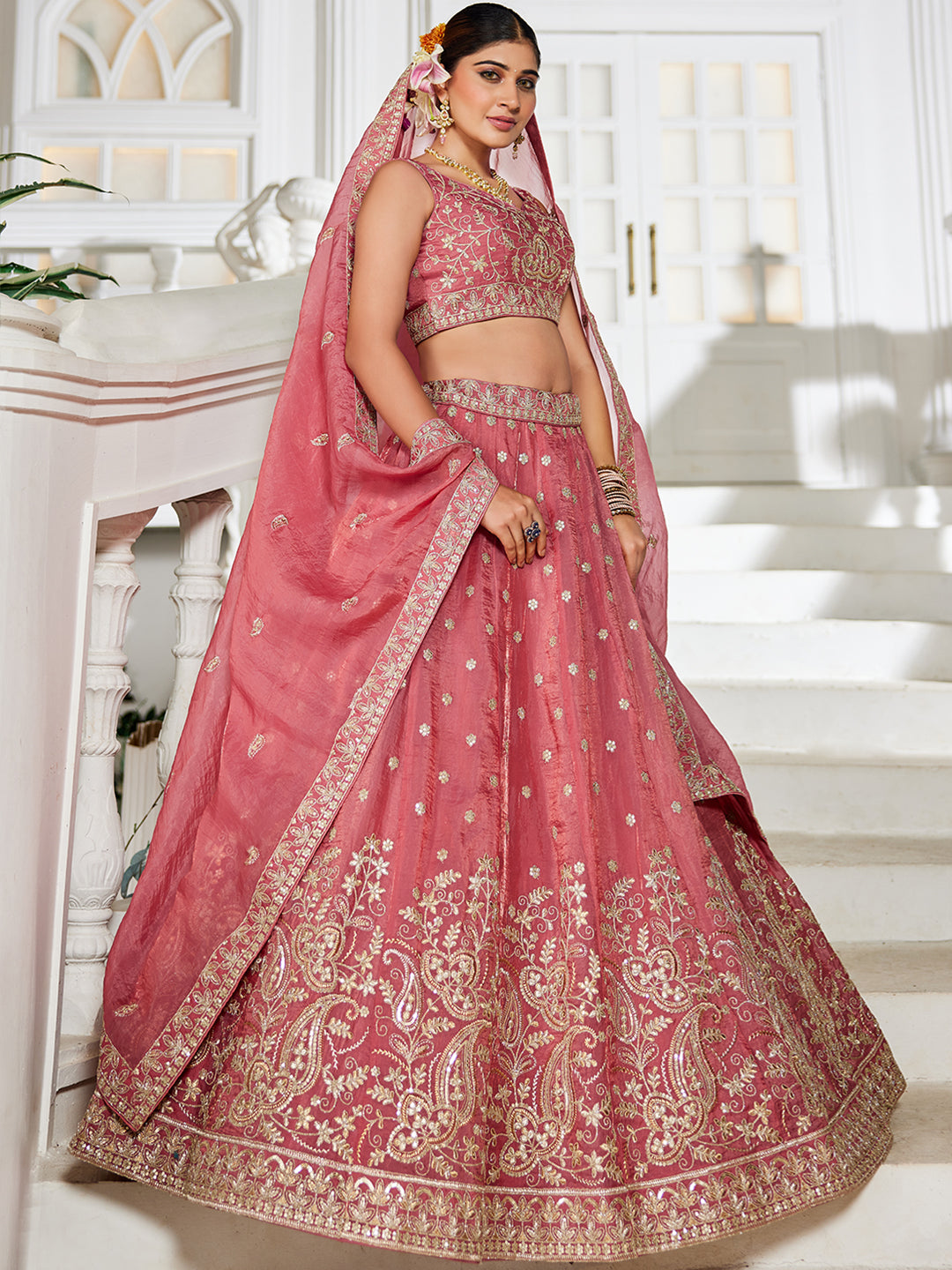 Step into a dreamy celebration with the Nakshatra Pink Organza Tissue Lehenga Choli! This playful ensemble dazzles with golden cording and sequin embroidery that twinkle like stars on soft pink fabric. The premium tissue material flows with a silky sheen, making every twirl a graceful moment. Complete with a matching embroidered blouse and coordinating dupatta, it’s your perfect partner for weddings and receptions. Pair it with gold accessories to sparkle and shine, turning heads and stealing hearts with effortless bridal charm. Note: Color may slightly be different from the actual item due to photographic lighting sources or the monitor's settings.
