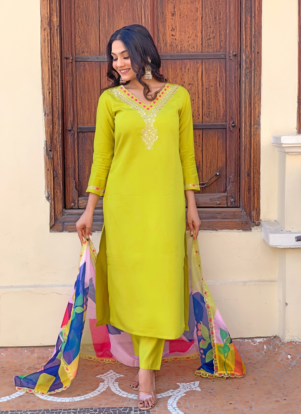 Add a splash of vibrance to your wardrobe with the Nakshatra Lemon Ethnic Kurta Set. Made with luxurious viscose silk that is known for its lightweight feel and subtle sheen, this elegant pant suit set is ready to wear for any occasion. The traditional neckline and vibrant print on the silk dupatta add a touch of sophistication to the perfect blend of tradition and modern elegance. Cheers to style! Note: Color may slightly be different from the actual item due to photographic lighting sources or the monitor's settings.
