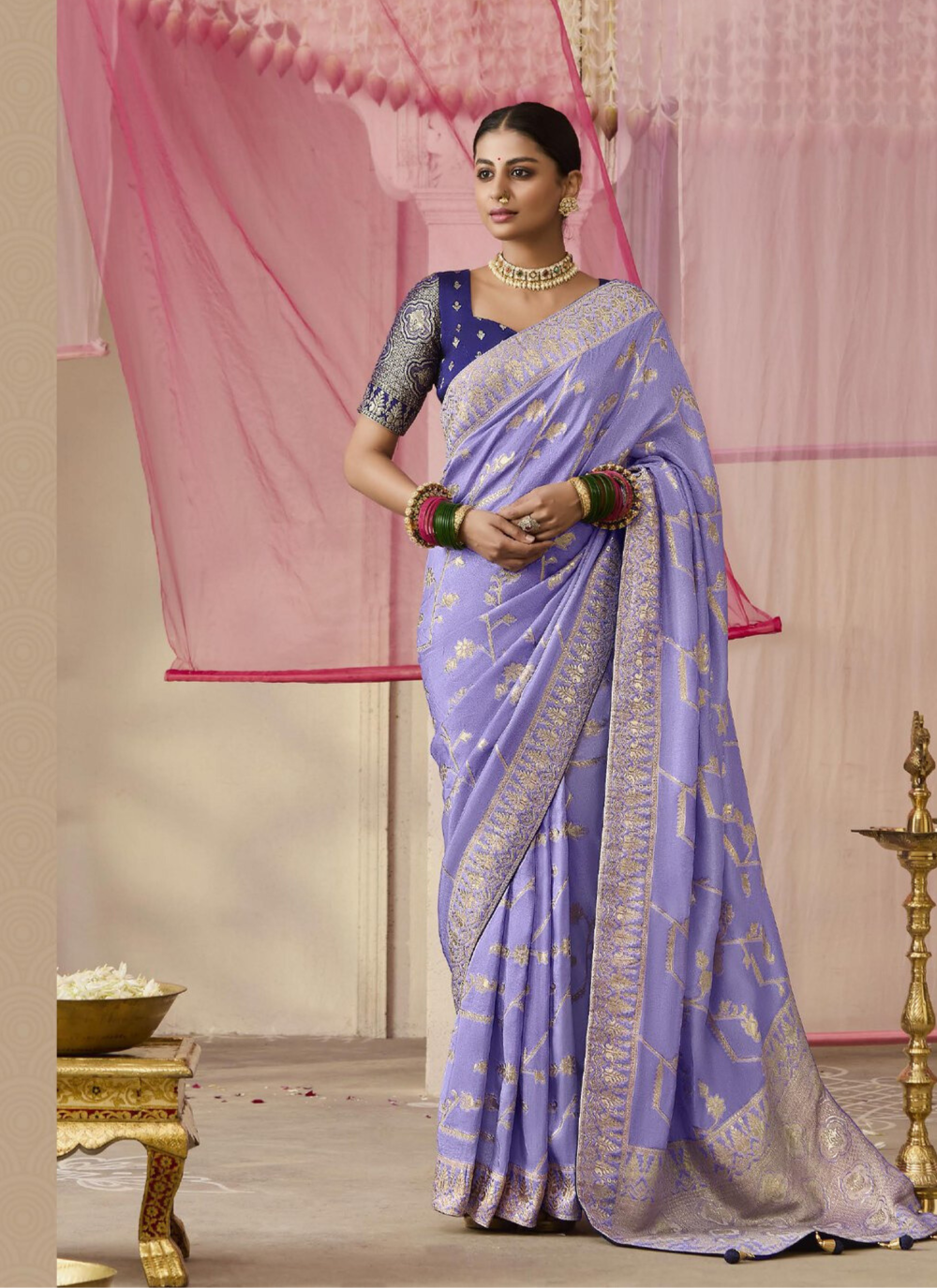 Add a touch of vintage grace to your look with the Nakshatra Light Lavender Dola silk saree. This lustrous saree is made of dola viscose silk and features a beautiful flower weaving pattern all over, perfect for party or festival wear.