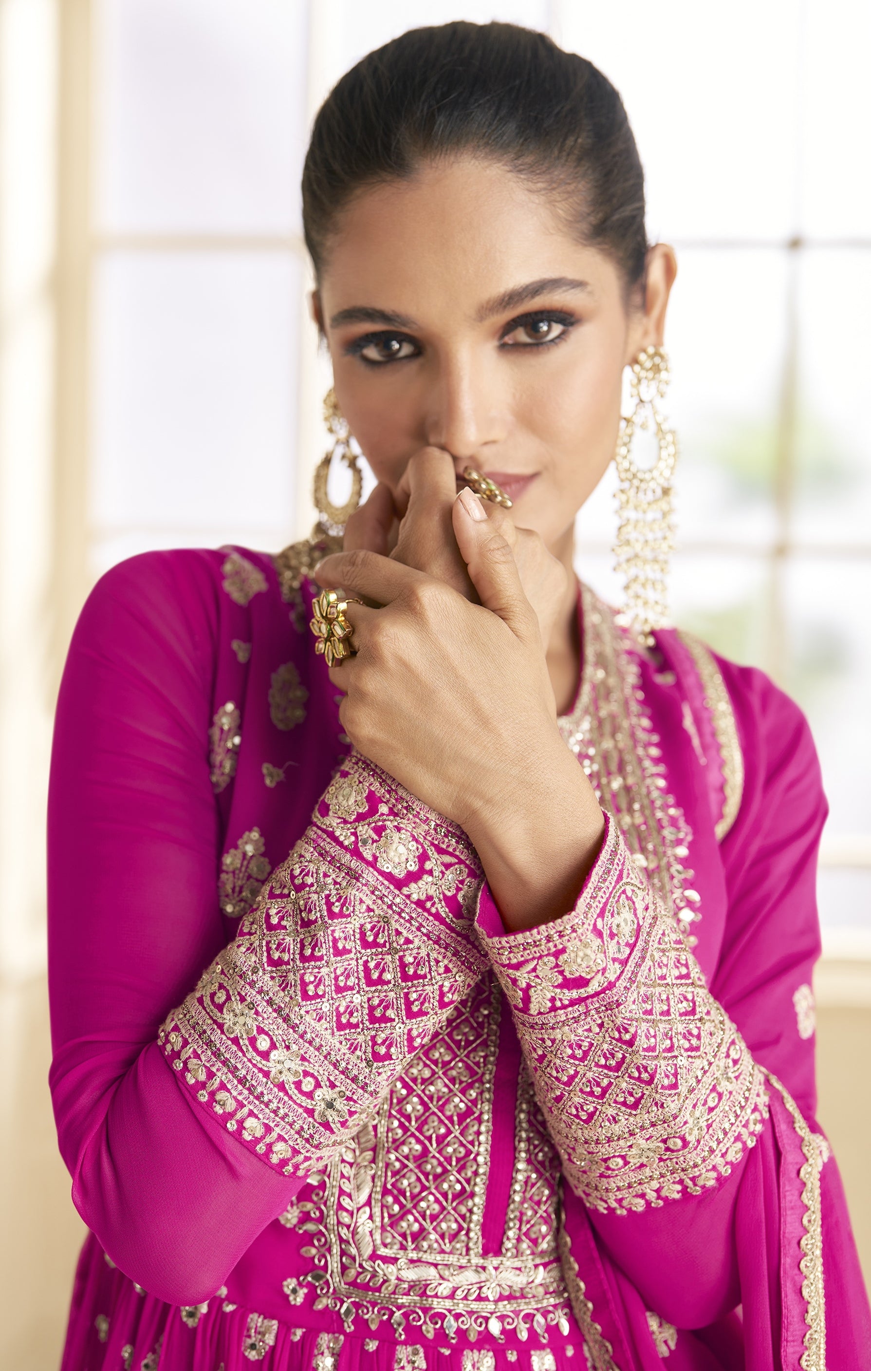Elevate your style game with this Nakshatra Magenta Georgette Anarkali suit. The stunning bright pink color, designer embroidery, and delicate sequin work make it the epitome of grace. Made with georgette fabric, it comes with a santoon bottom and net dupatta for an elegant touch. Get ready to turn heads!