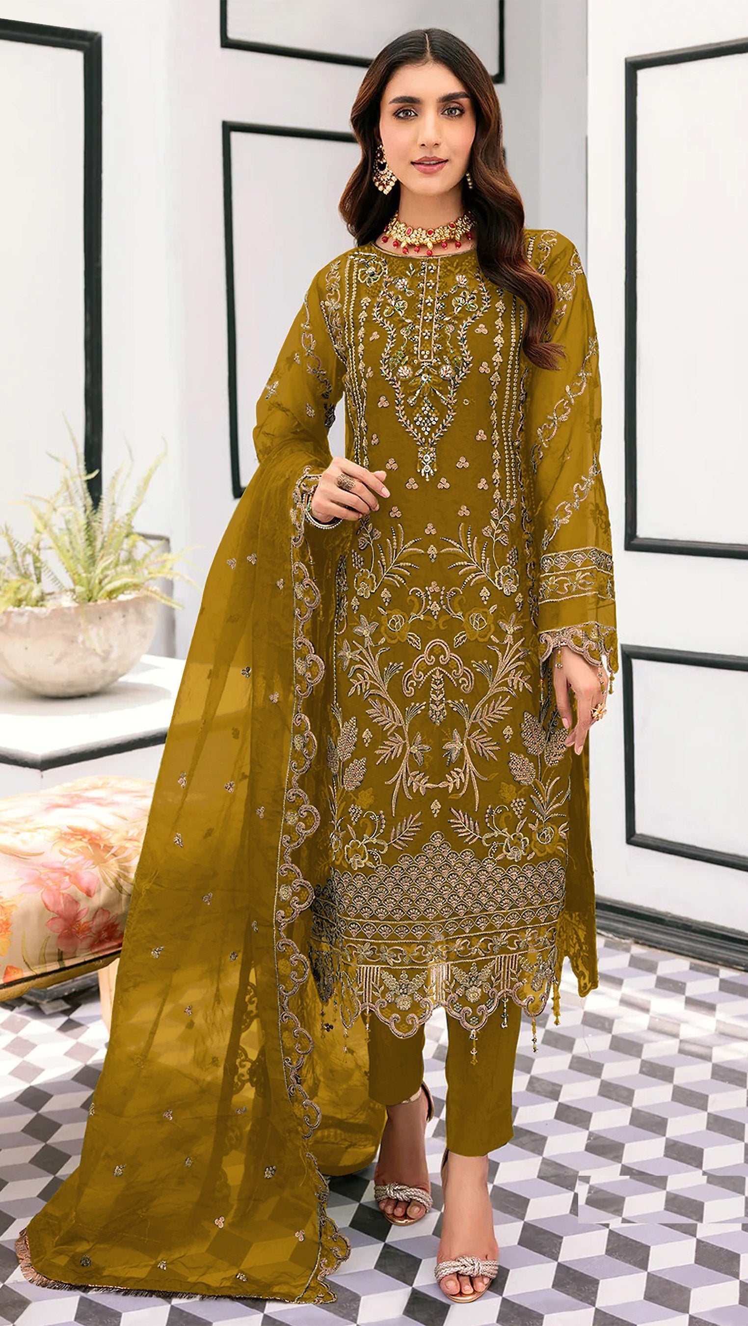 Introducing the Nakshatra Mahendi Embroidered Suit, made with premium fabric organza and santoon. The organza top is adorned with beautiful lace and sequence work on the sleeves and suit, while the santoon inner adds to the luxurious feel. Complete the look with the stunning organza dupatta featuring heavy designer embroidery. Show off your unique style with this playful and quirky suit! Note: Color may slightly be different from the actual item due to photographic lighting sources or the monitor's settings.