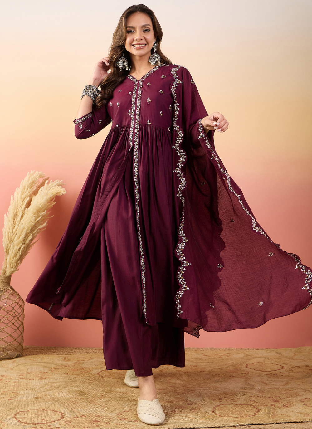 Indulge in our Nakshatra Maroon Colored Silk Embroided Suit. This luxurious piece features designer embroidery, playful mustard accents, and the unique touch of silk. Stand out in style with this quirky and fun addition to your wardrobe!Note: Color may slightly be different from the actual item due to photographic lighting sources or the monitor's settings.