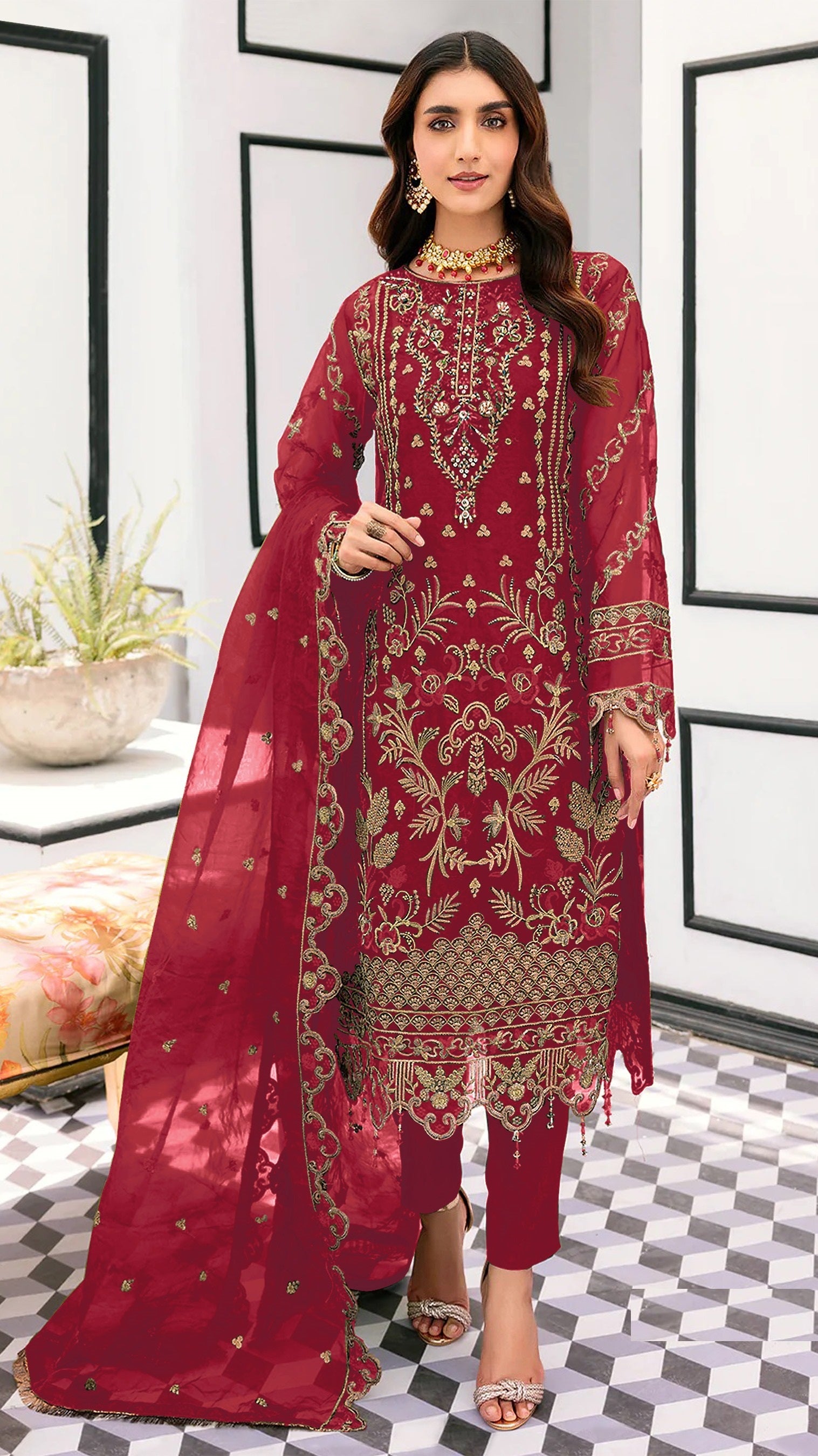 Introducing the Nakshatra Maroon Embroidered Suit, made with premium fabric organza and santoon. The organza top is adorned with beautiful lace and sequence work on the sleeves and suit, while the santoon inner adds to the luxurious feel. Complete the look with the stunning organza dupatta featuring heavy designer embroidery. Show off your unique style with this playful and quirky suit! Note: Color may slightly be different from the actual item due to photographic lighting sources or the monitor's settings.