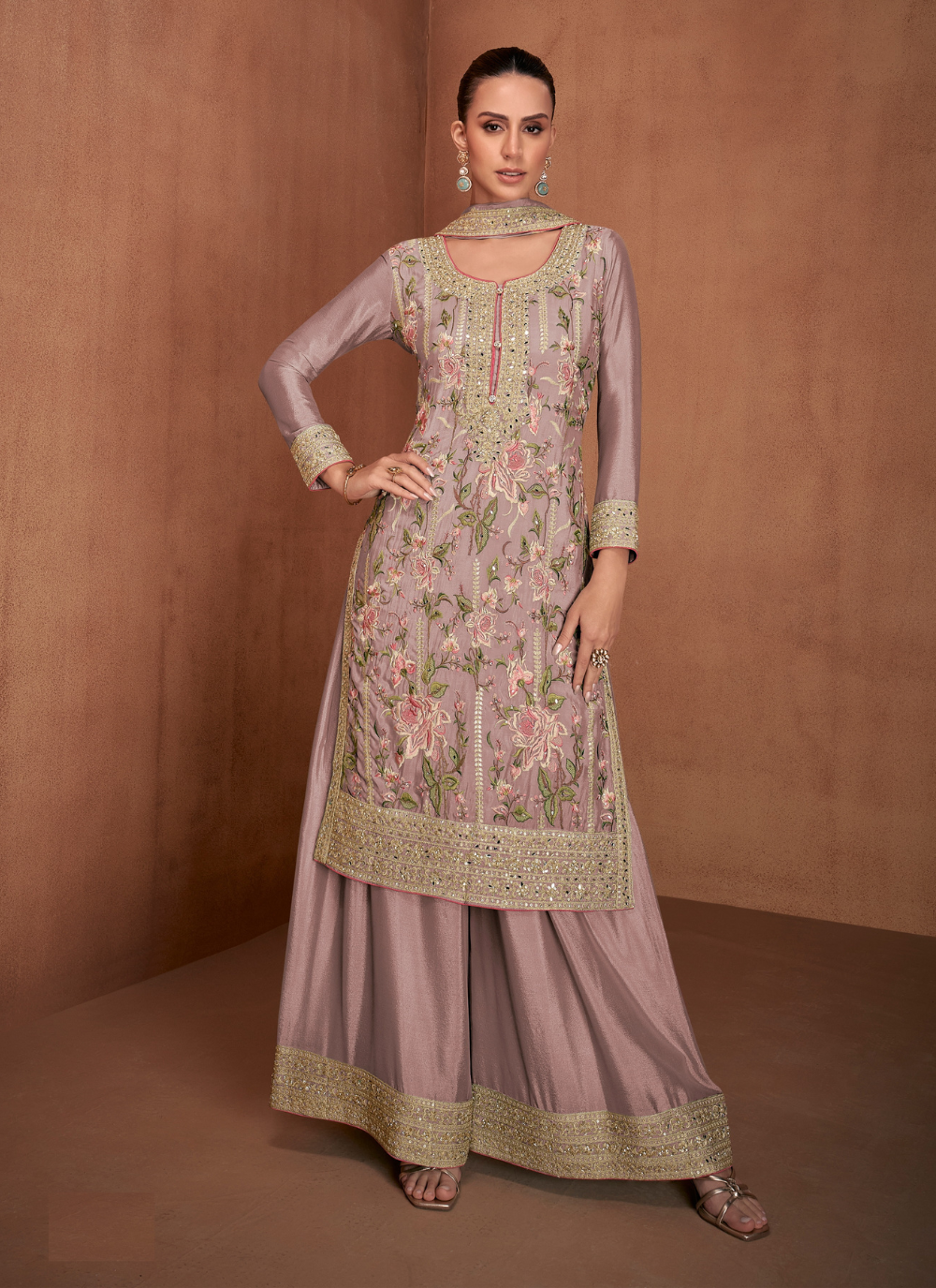 Celebrate in style with the Nakshatra Mauve Heavy Embroided Festive Wear! This chic palazzo suit combines traditional florals with modern chinnon silk material and intricate embroidery. The flared gharara palazzo and embellished dupatta add luxurious details, making it perfect for any festive occasion. Don't miss out on this unique and elegant look!