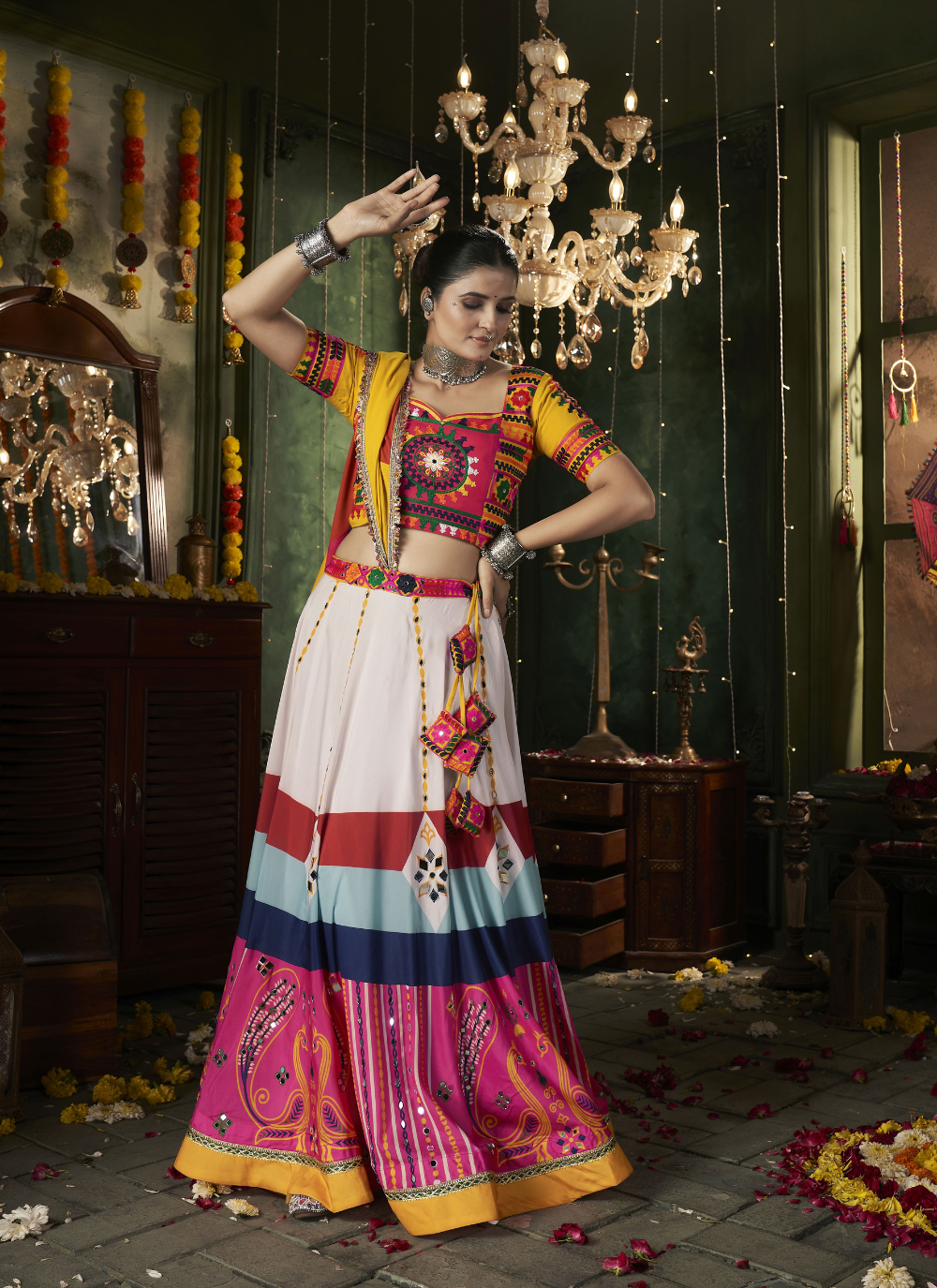 Get ready to turn heads with the Nakshatra White Multicolored Navratri Lehenga Choli. Made from comfortable muslin cotton fabric and fully stitched for a perfect fit, this stunning piece features intricate mirror work and heavy thread embroidery. The designer digital print adds a touch of uniqueness, making it perfect for Navratris and garba nights. Dare to stand out in this one-of-a-kind lehenga choli!