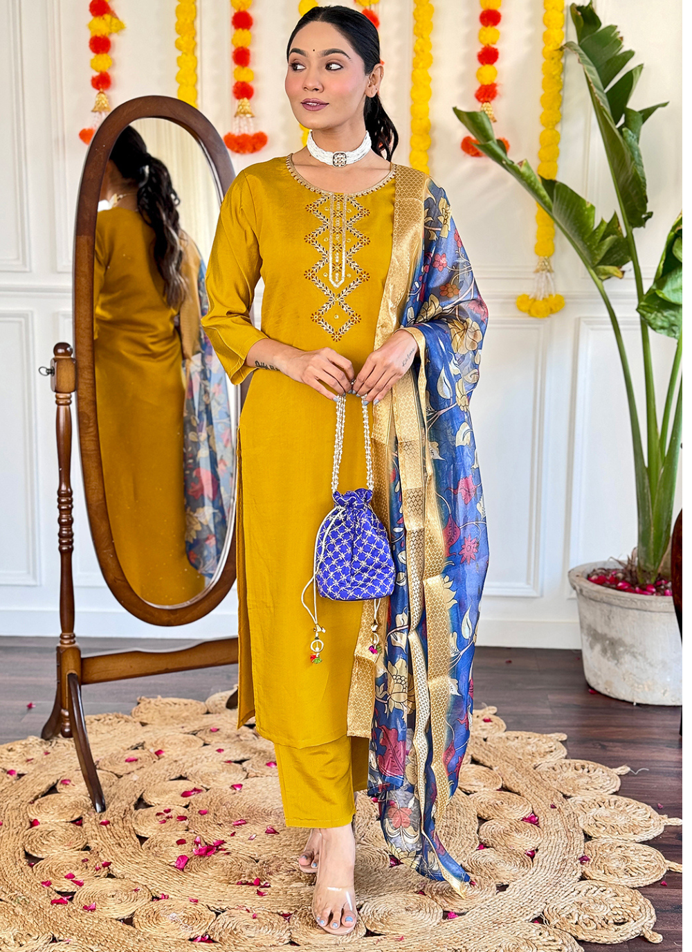 Unleash your inner fun and playfulness with the Nakshatra Mustard Readymade Suit. Crafted with soft viscose fabric, these suits boast a bold digital print and intricate embroidery. The delicate dupatta adds the perfect touch for work or everyday wear. Embrace style and comfort with these quirky must-haves! Note: Color may slightly be different from the actual item due to photographic lighting sources or the monitor's settings.