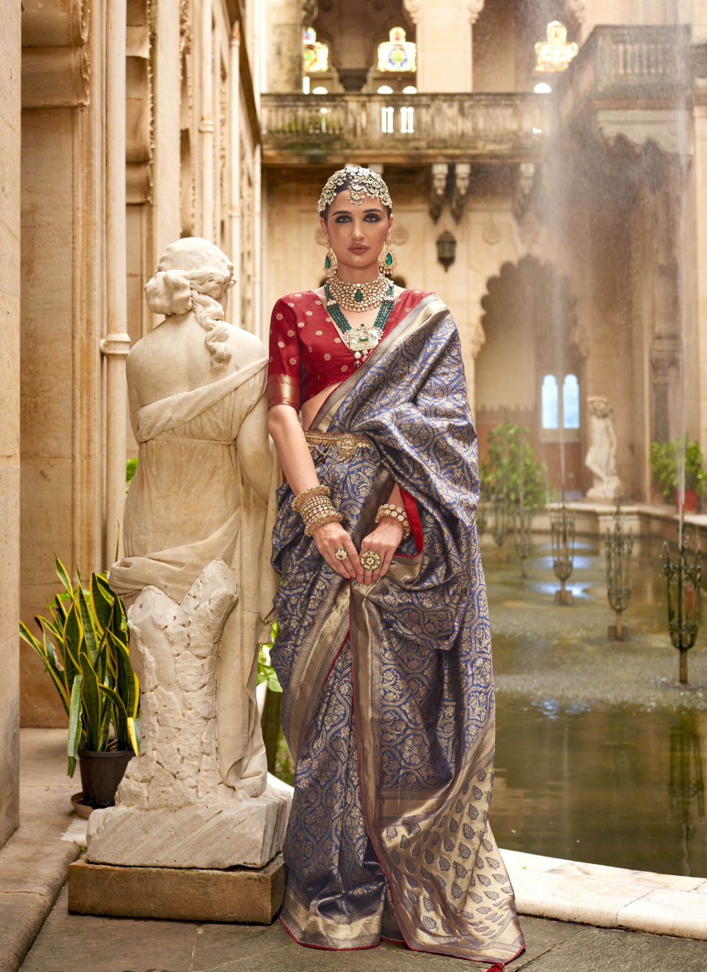 Transport yourself to ethereal elegance with this Nakshatra Navy Blue Zari Woven Saree. Exquisitely crafted from B C P silk, this banarasi saree features intricate zari designer work that exudes richness. Comes with a contrast blouse and tassels for added flair. Perfect for any occasion, this saree will make you look stunning and elegant. Note: Color may slightly be different from the actual item due to photographic lighting sources or the monitor's settings.