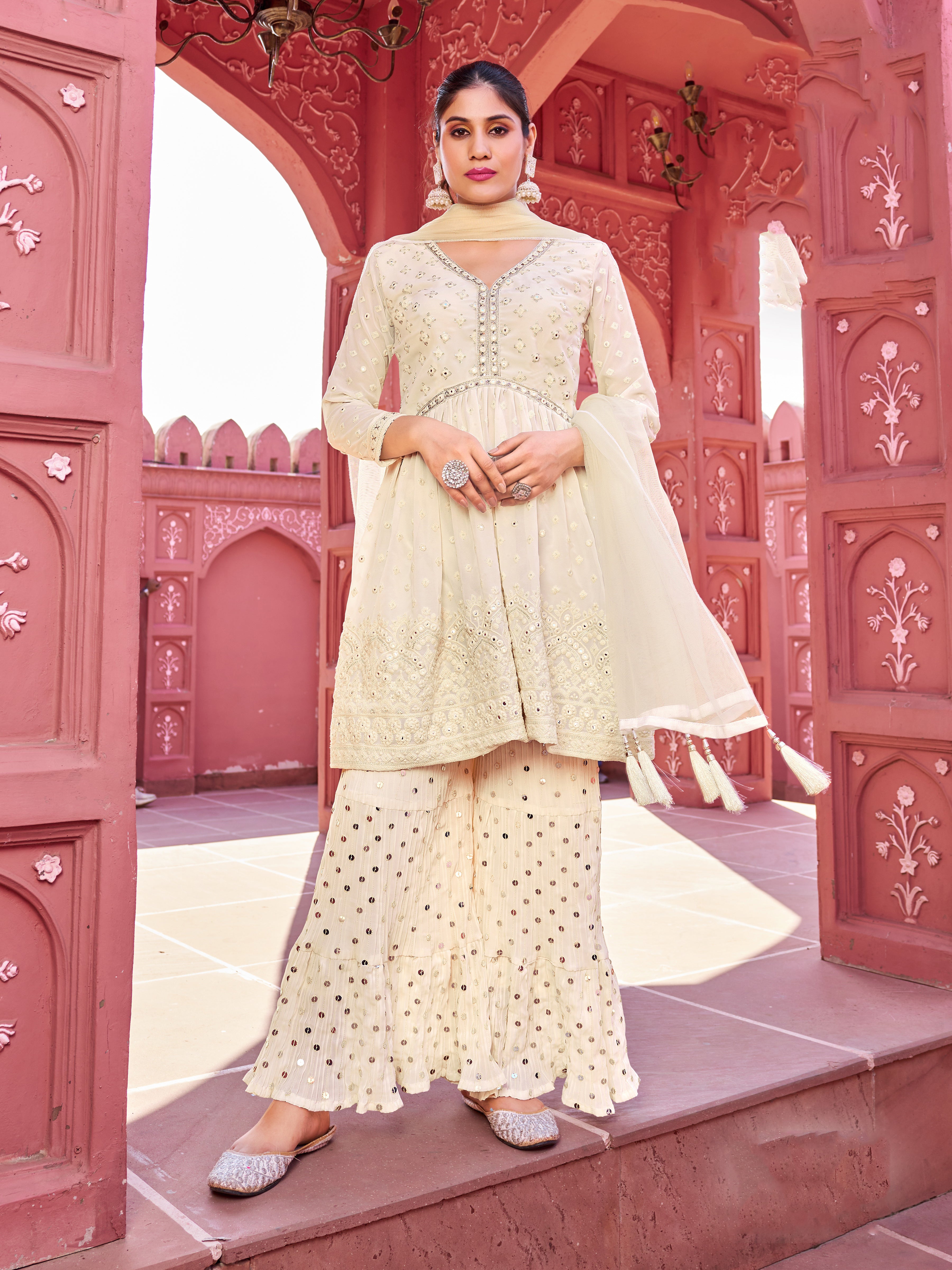 Slay the night with our Nakshatra off white Mirrored Sharara set. Made of flowy georgette, this sharara set features heavy thread embroidery work and sparkling mirror details. Turn heads and stand out in the crowd with this black colored set. Perfect for adding some glamour to any occasion!