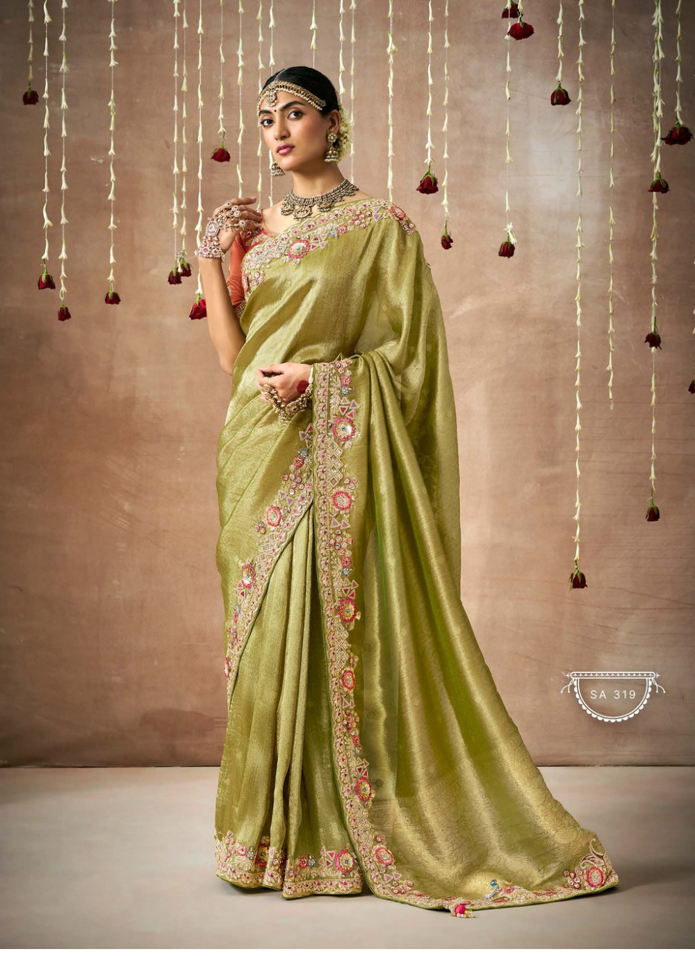 Indulge in the exquisite beauty of our Nakshatra Olive Green silk Bridal saree. Each thread, motif, and drape is a masterpiece of Indian craftsmanship, telling a story of our rich culture and passion. Made with tissue dola silk and adorned with intricate zari embroidery, pearls, mirrors, and stone work, this saree will make you feel like a royal queen on your special day. A must-have for all brides-to-be, mothers, sisters, and sisters-in-law.