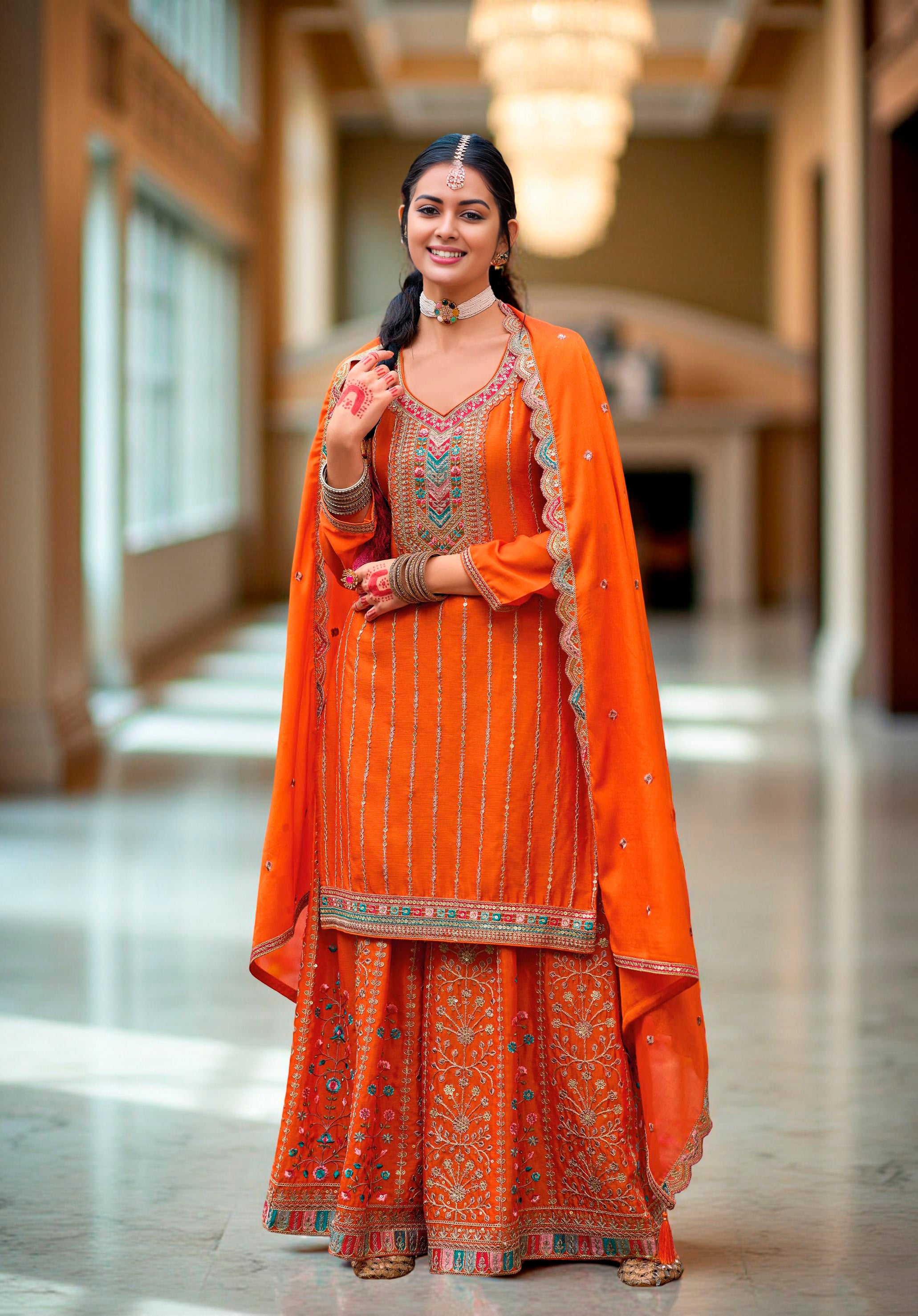 Step into vibrant elegance with the Nakshatra Orange Chinon Embroidered Suit. This stunning set pairs a richly embroidered Chinon top with matching premium Chinon palazzo pants, both adorned with heavy embroidery, fancy dori, and sparkling sequins from front to back. The soft crepe inner fabric ensures comfort, while the 2.20-meter flowing dupatta completes the look with matching intricate embroidery. Perfect for celebrations, this playful ensemble combines intricate craftsmanship with lively color to make you stand out wherever you go. Note: Color may slightly be different from the actual item due