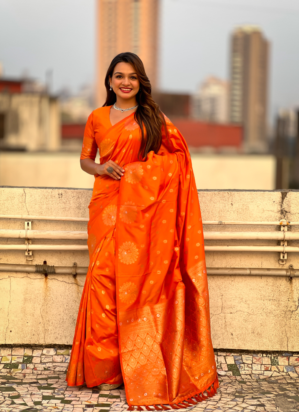 Get ready to dazzle in this Nakshatra Orange Soft Silk Dual Zari Saree! Made from moonga silk fabric, it features traditional Peacock Motifs that add a rich, elegant, and traditional touch. Perfect for parties, traditional events, and ceremonies like haldi and mehendi. These vibrant and beautifully designed sarees are sure to make you stand out in the crowd! Note: Color may slightly be different from the actual item due to photographic lighting sources or the monitor's settings.