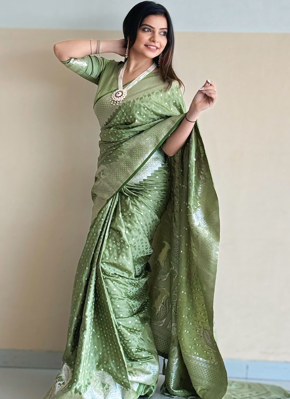 Indulge in luxury and grace with our Nakshatra Pastel Green Banarasi Silk Sari. The stunning Green hue and intricate zari weaving create an elegant and timeless design. Perfect for weddings and special occasions, the small buttis add a touch of traditional charm. Elevate your wardrobe with this beautiful and versatile sari!