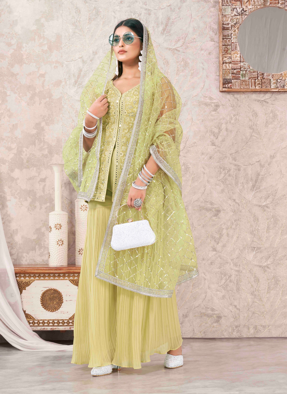Step out in style with the Nakshatra Sharara set. Crafted from georgette fabric, this set features a stylish and classy design that is perfect for ceremonies, parties, and receptions. The heavy net dupatta with sequence and heavy border work adds a touch of elegance to the navy blue ensemble. Show off your unique and playful fashion sense with this beautiful set!